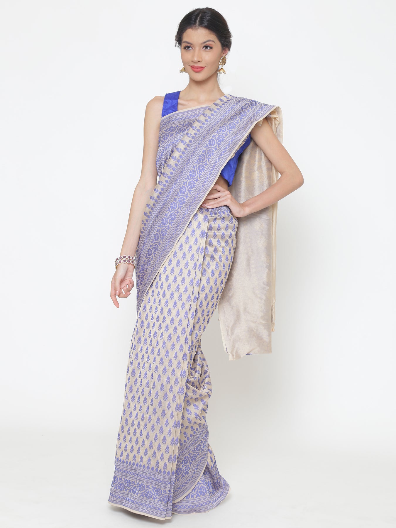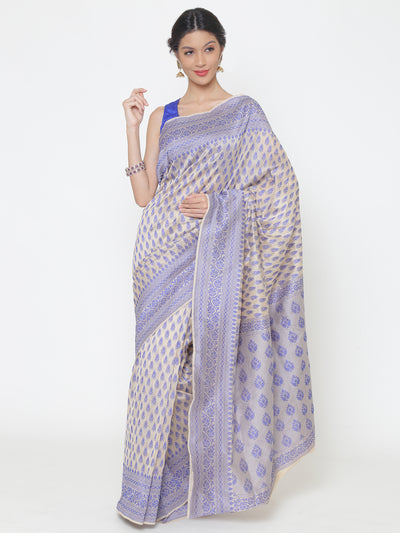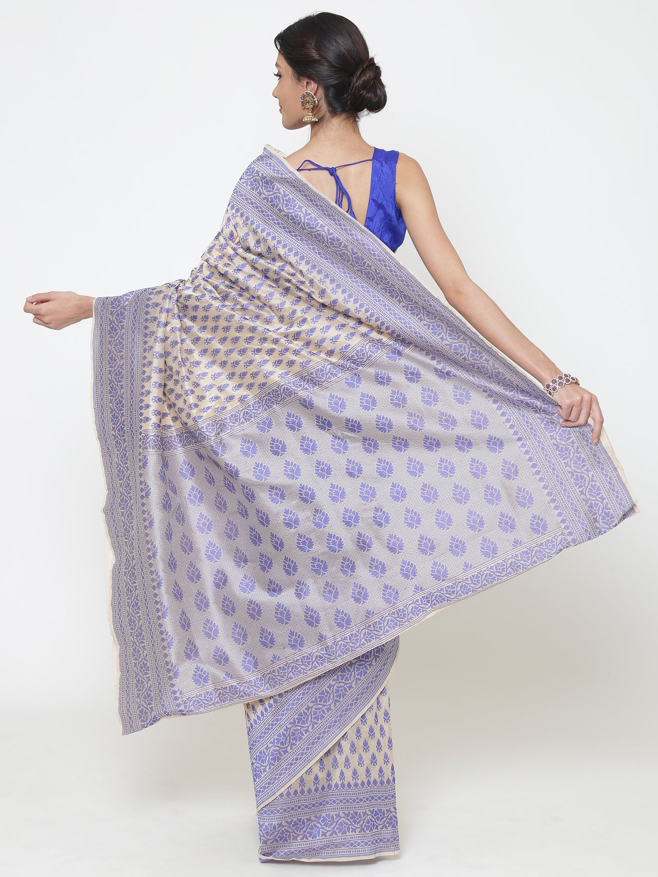 Indigo Cotton Silk saree with handloom weaving floral patterns and a broad border