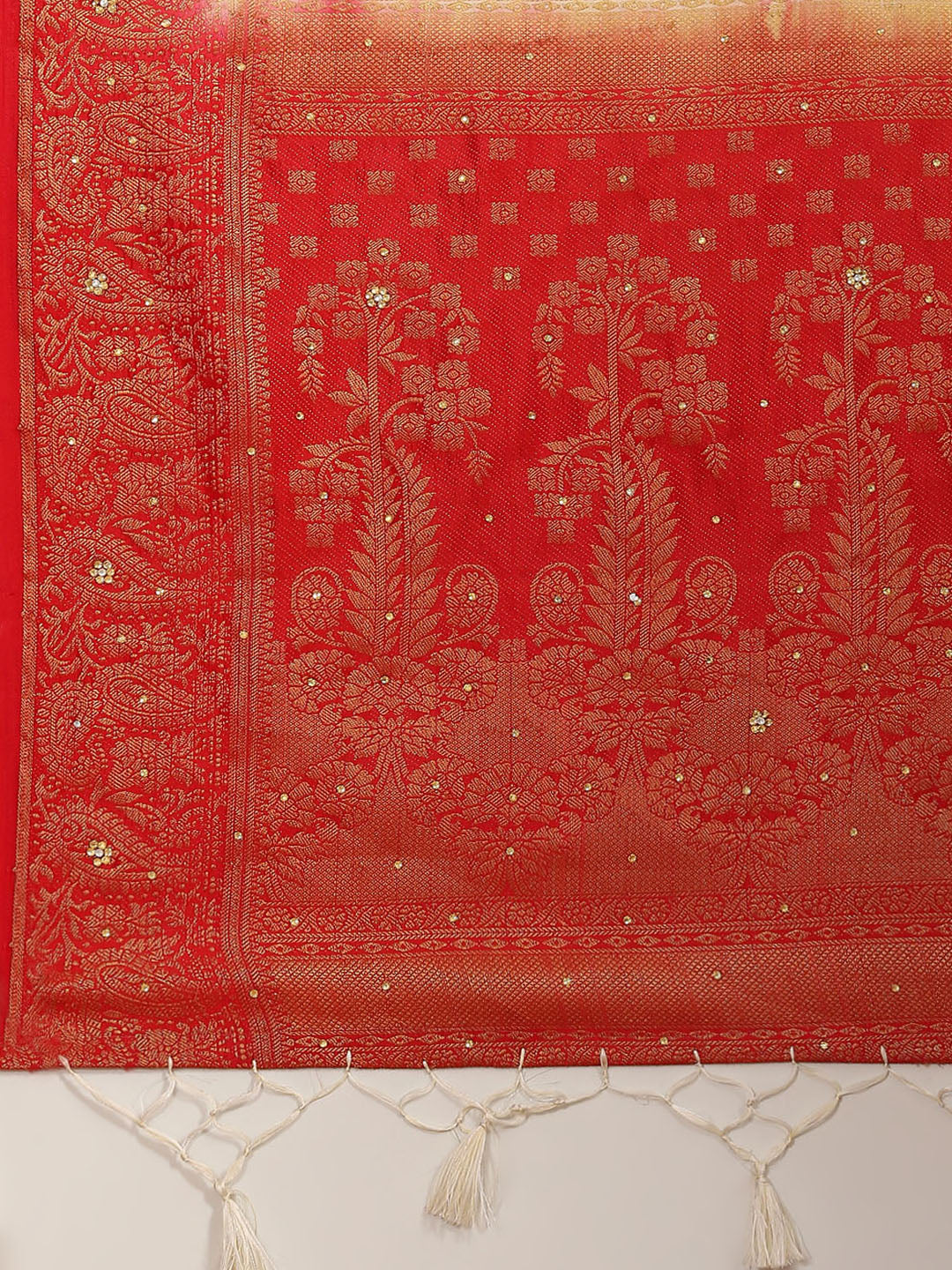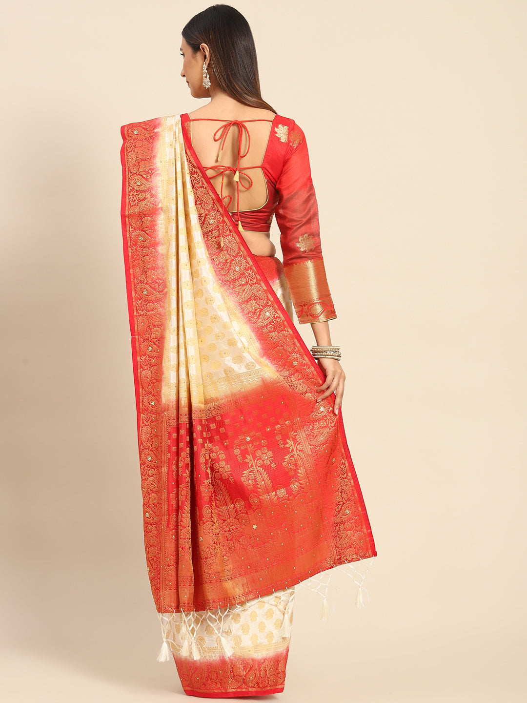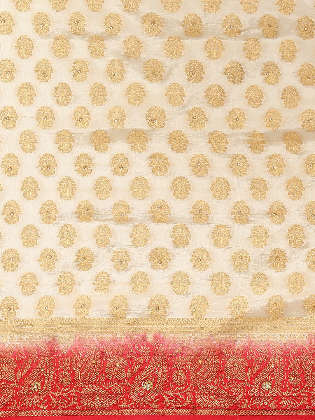 Cream Red Banarasi Paisley Motifs Stone Embellished Silk Saree
