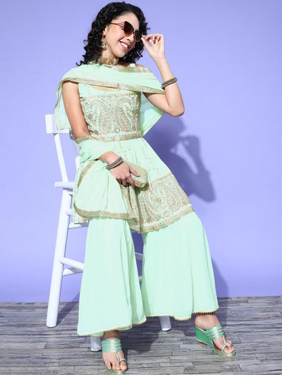 Pastel Green Resham & Zari Embroidered Peplum Kurta Sharara Set