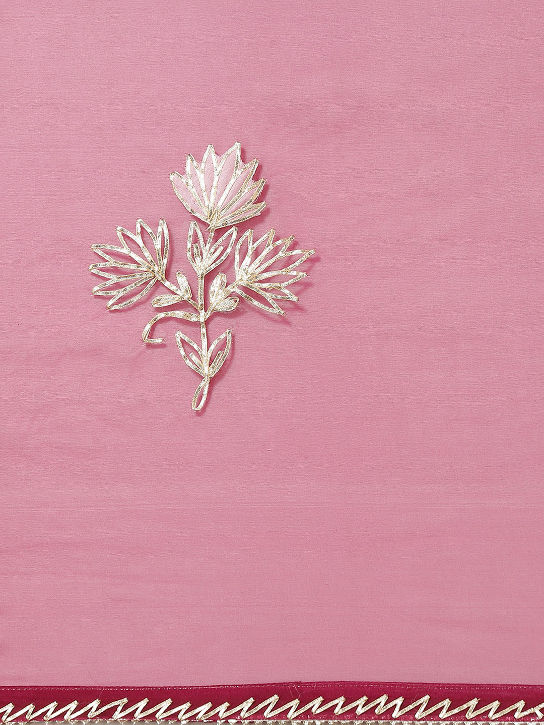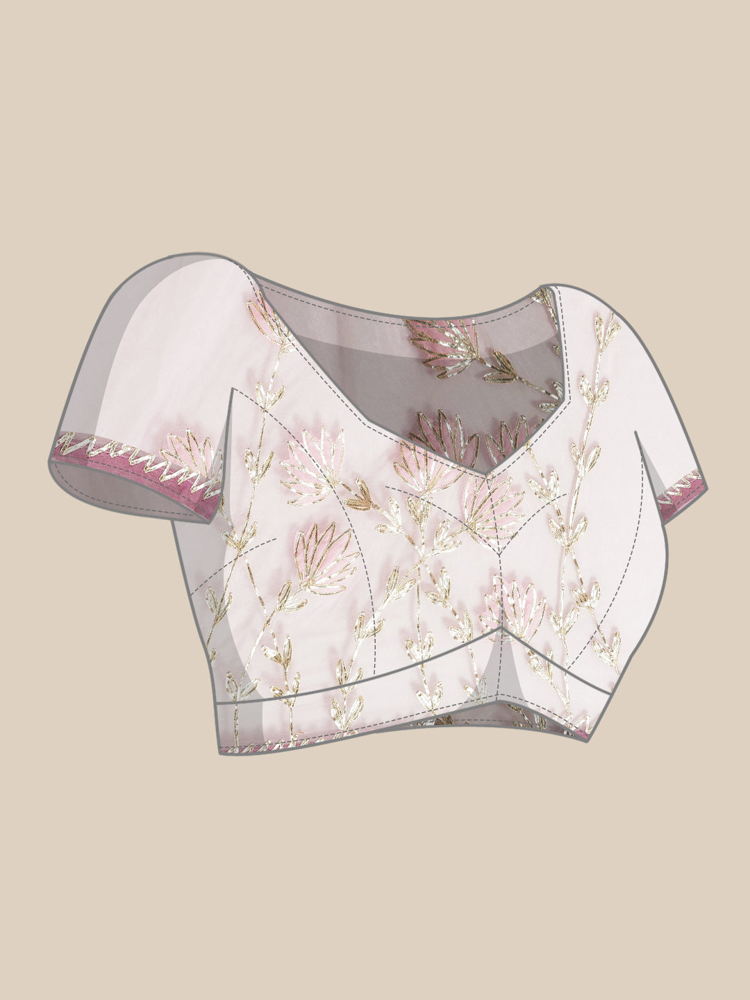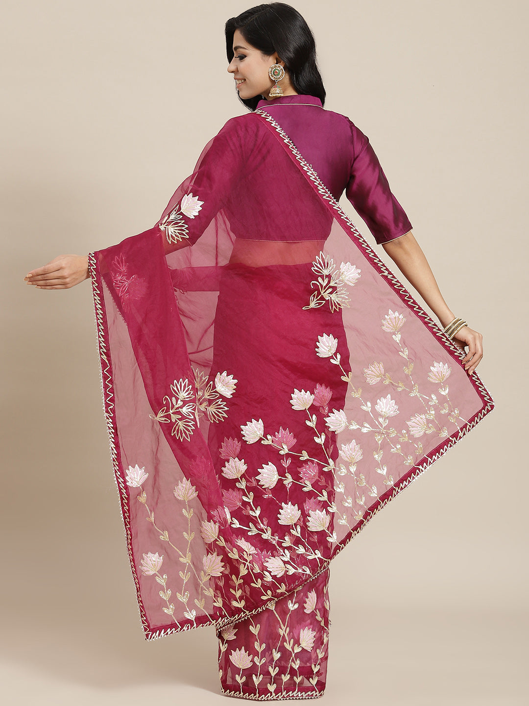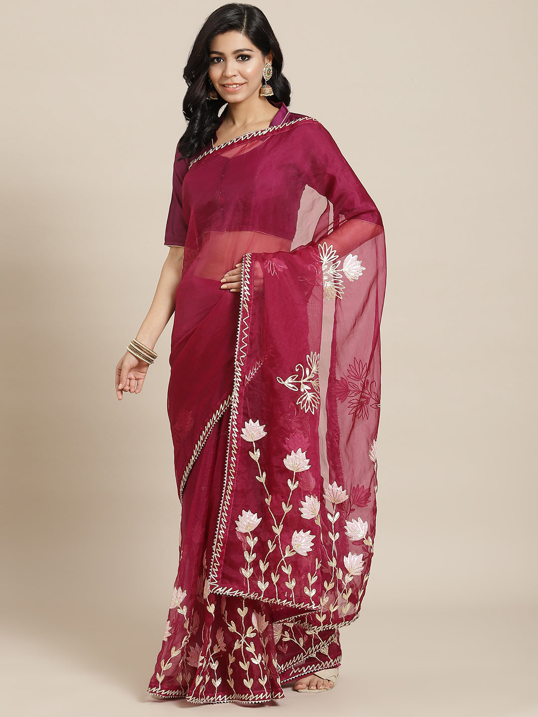 Wine Organza Jaipuri Saree with Resham Embroidery & Contrast Blouse