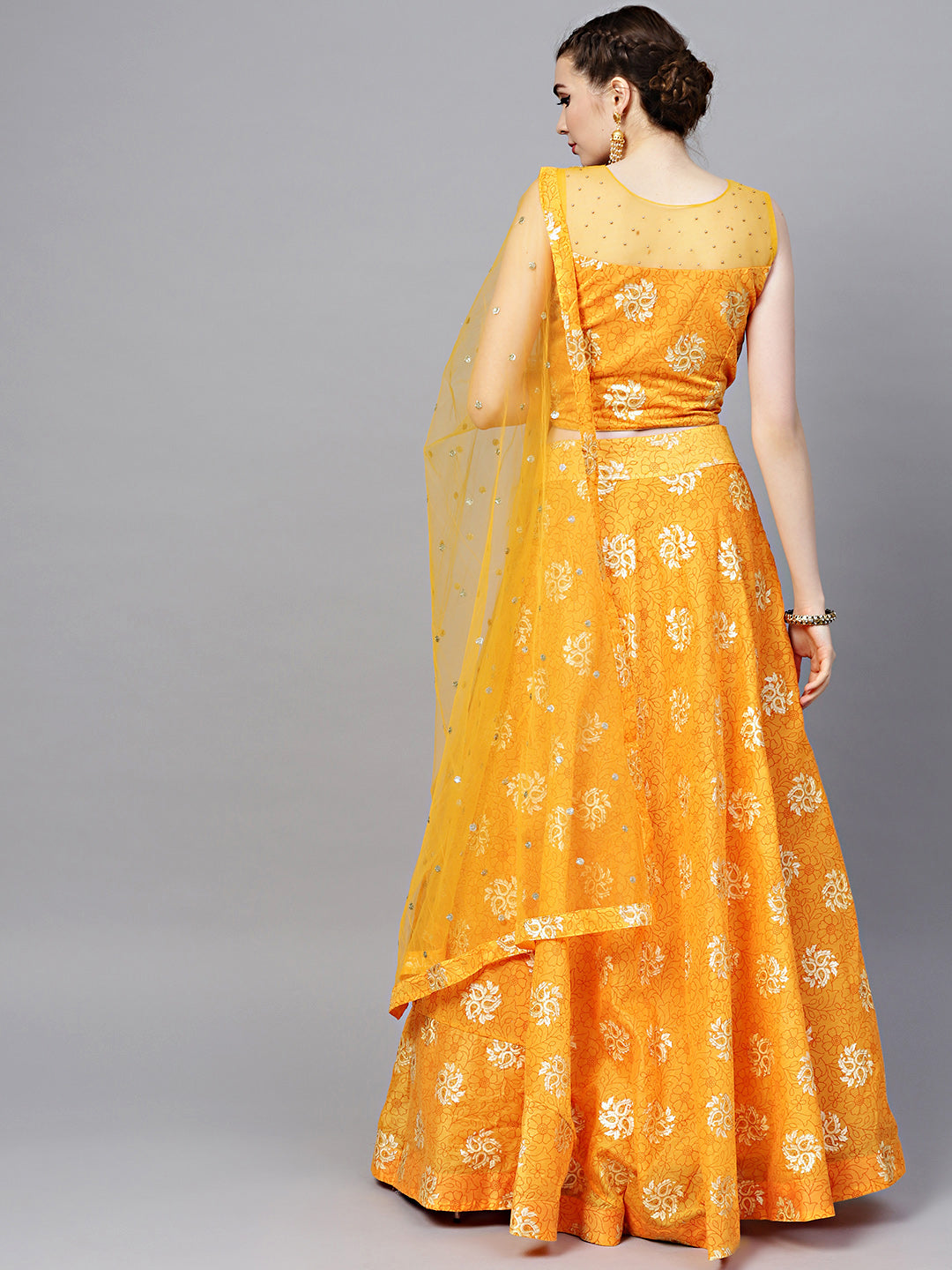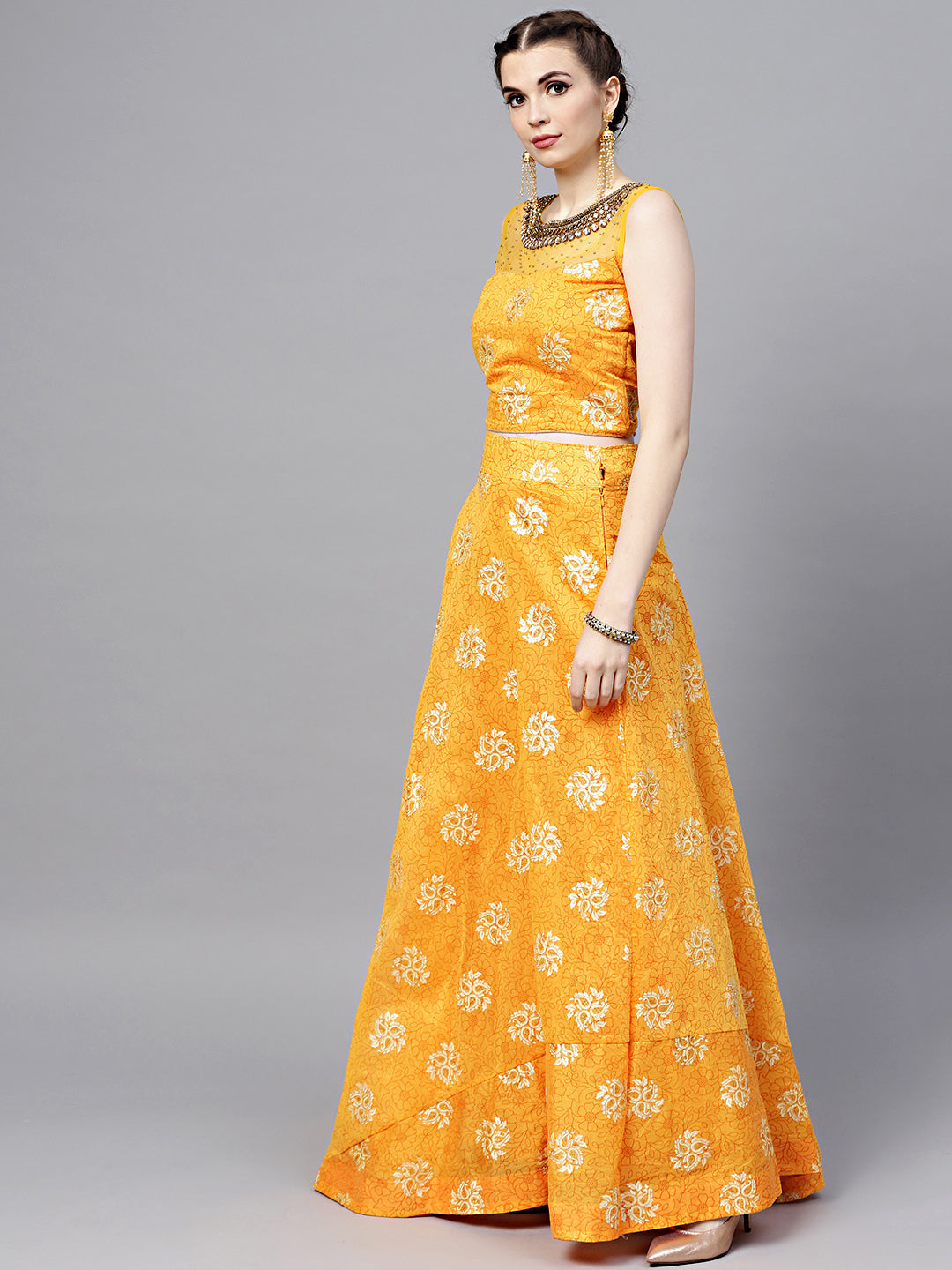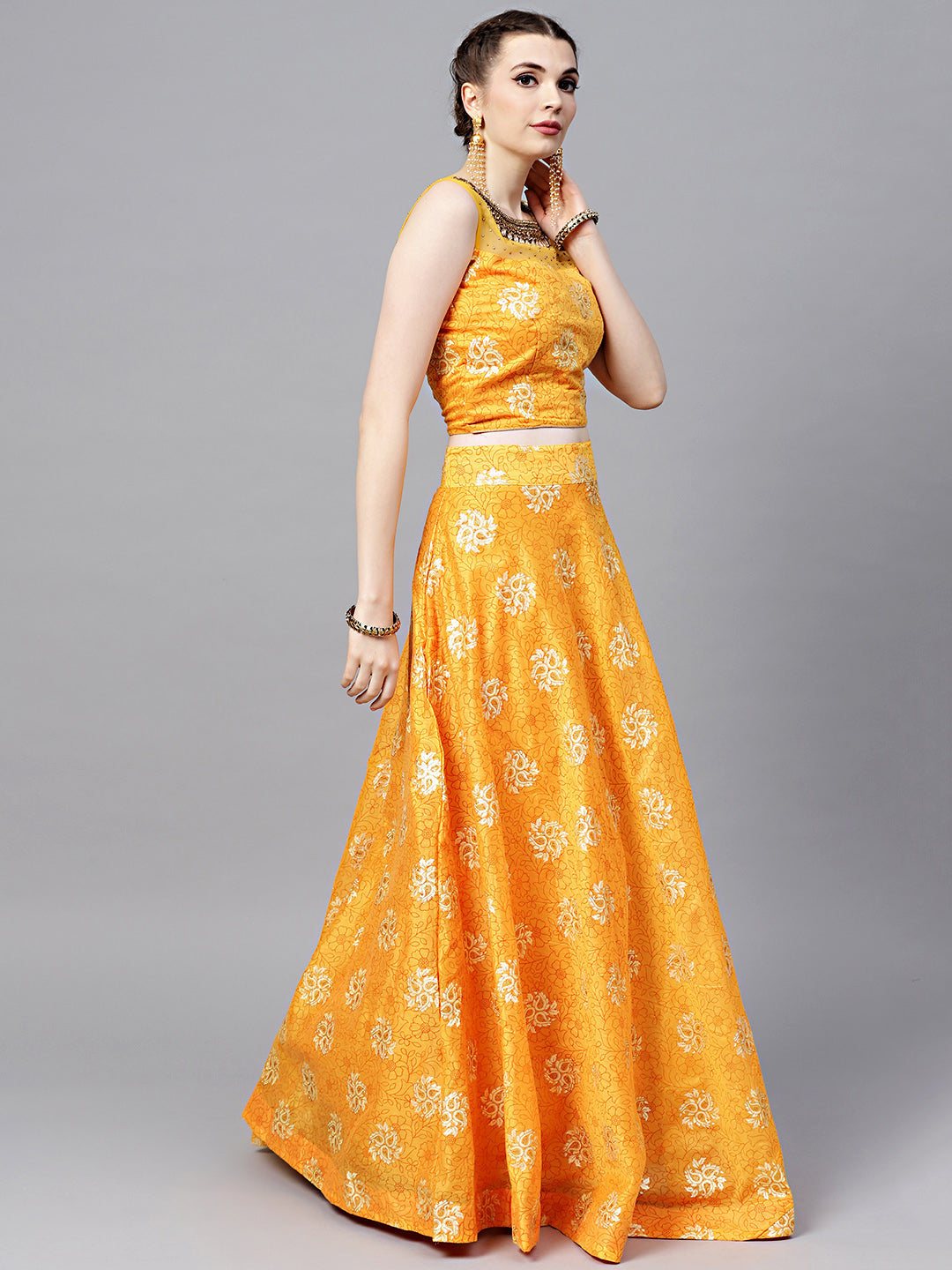 Embroidered Foil Print Crop Top Lehenga with Jeweled Neckline
