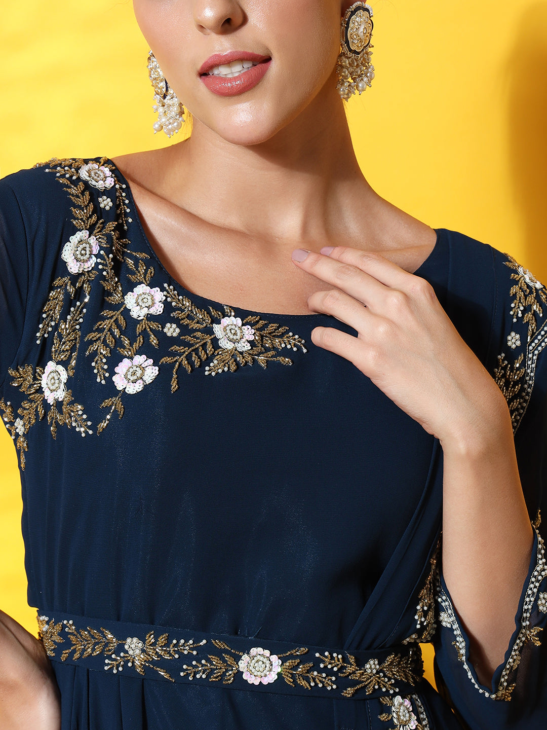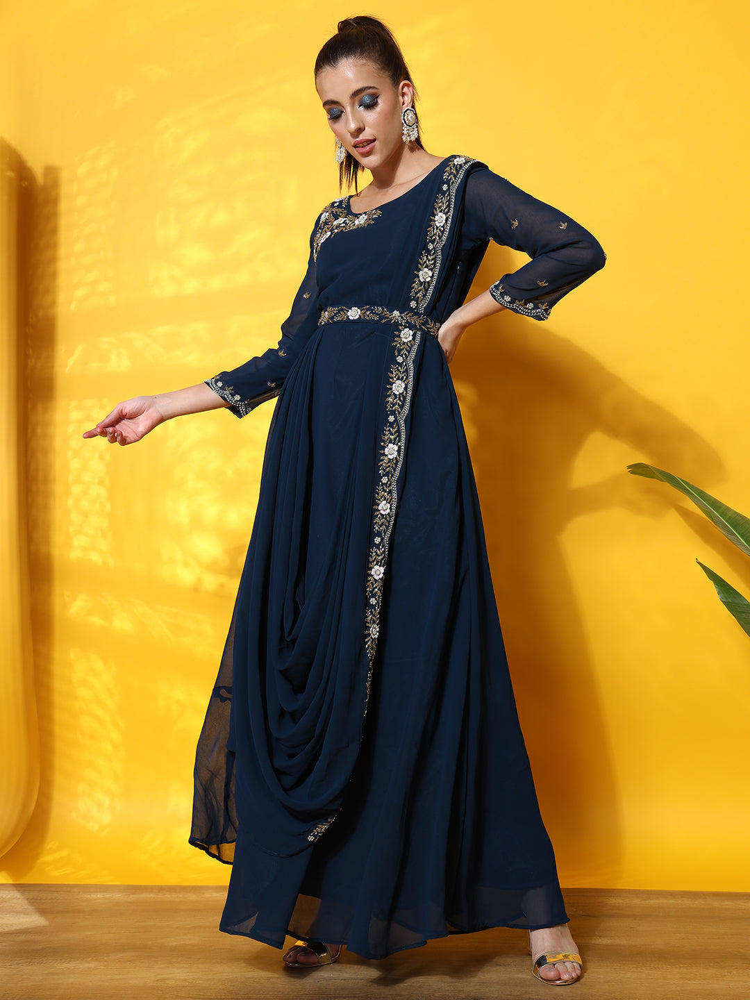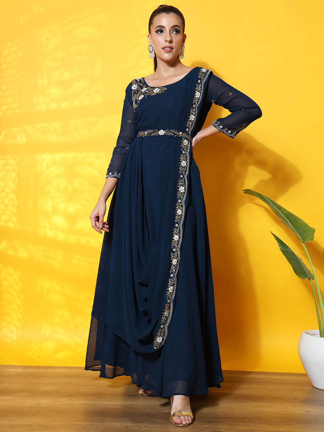 Pre Draped Saree Style Dress with Attached dupatta & Belt