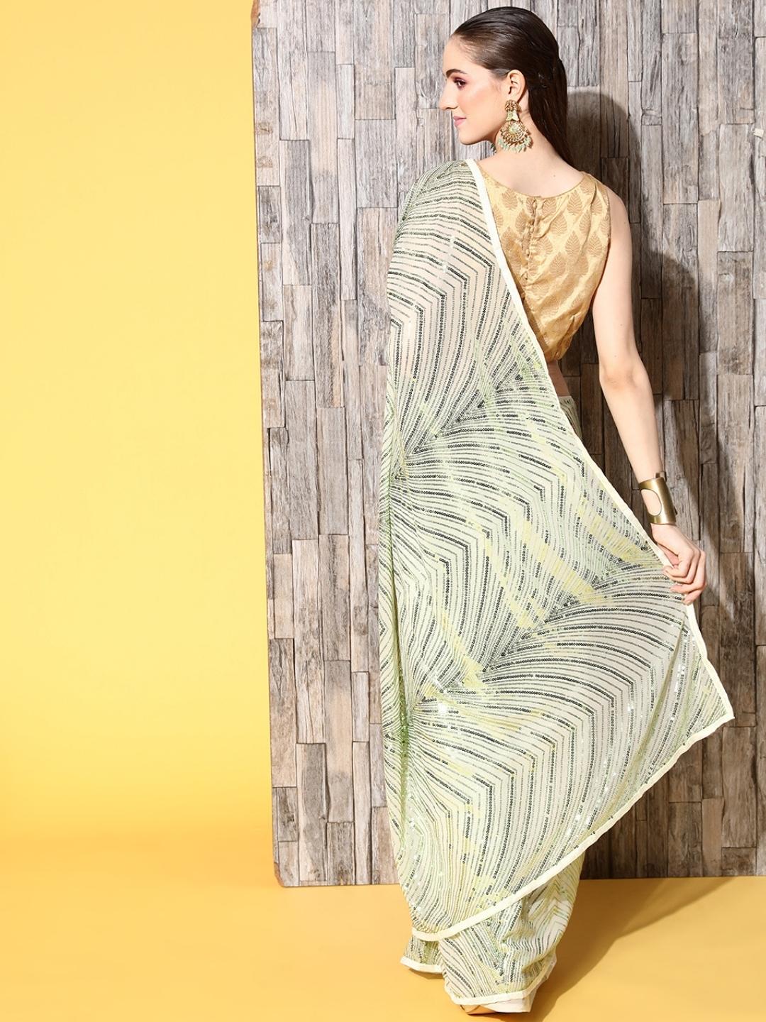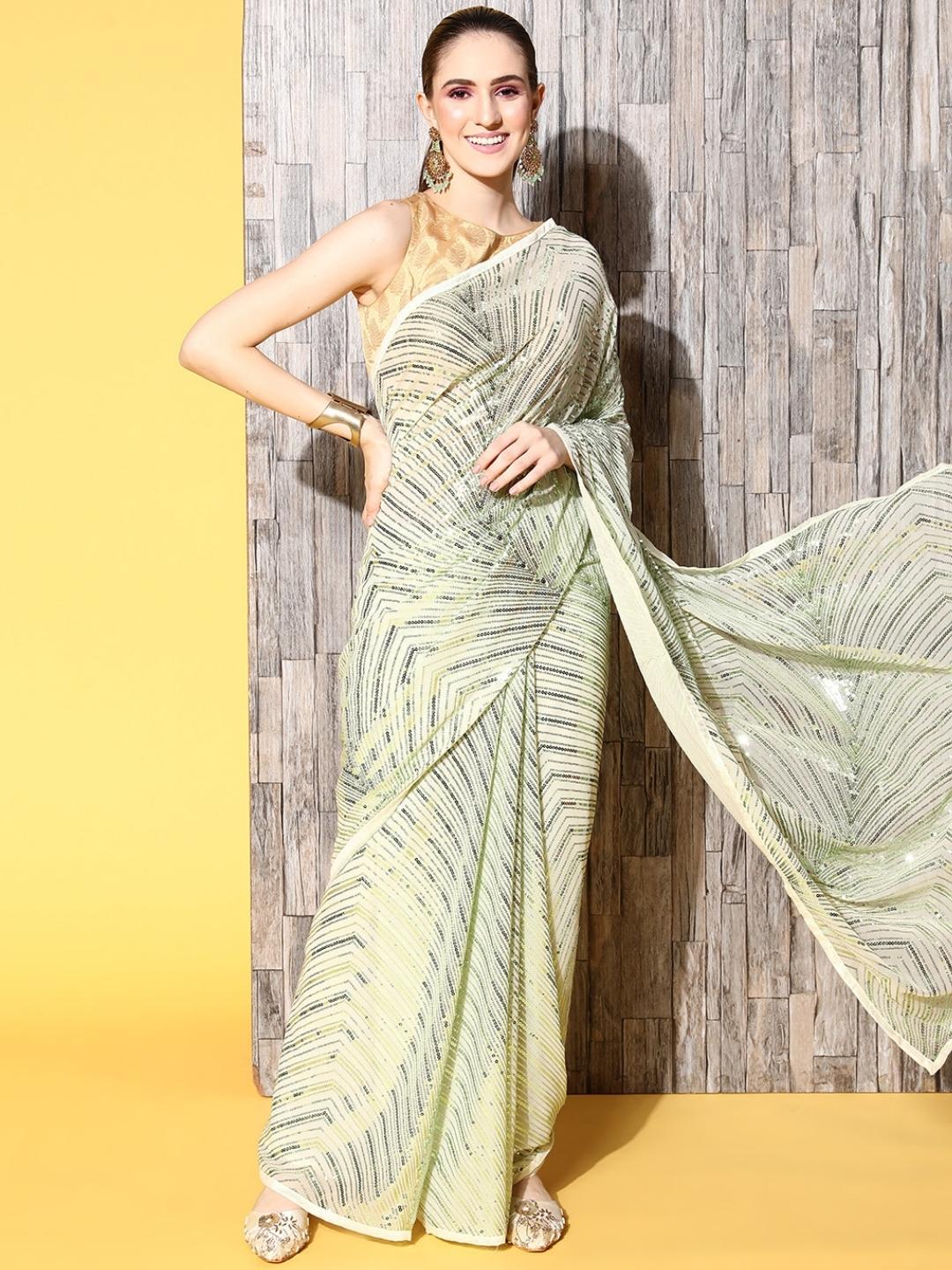 Sea Green Crystal Studded Saree with Resham Embroidered Floral motifs