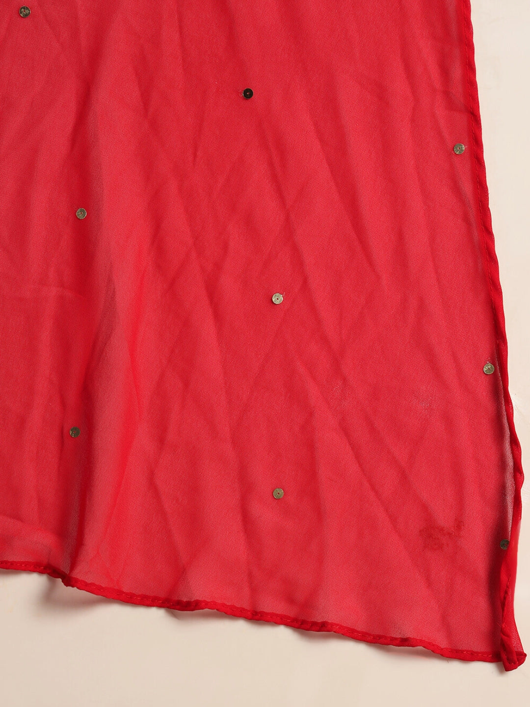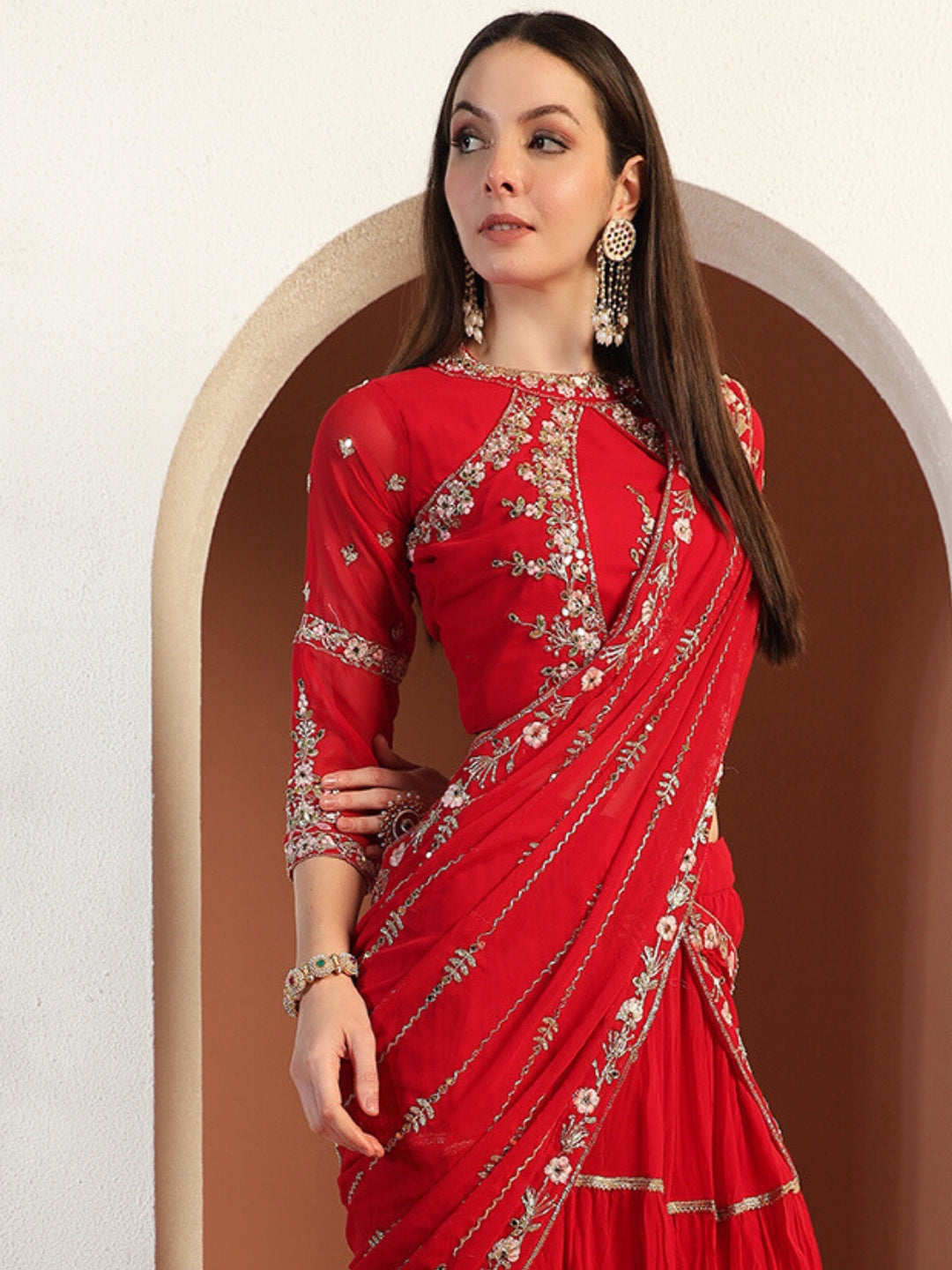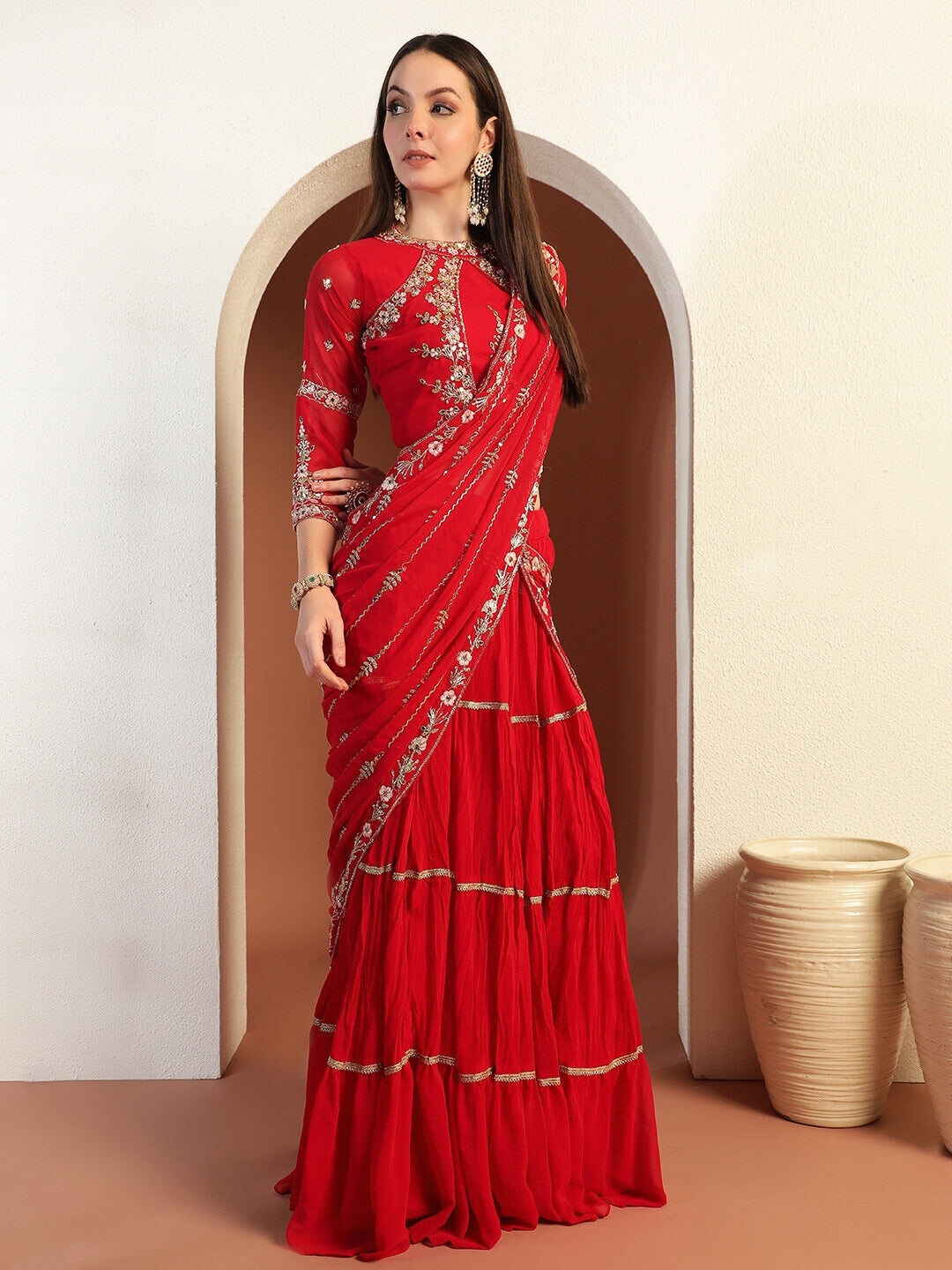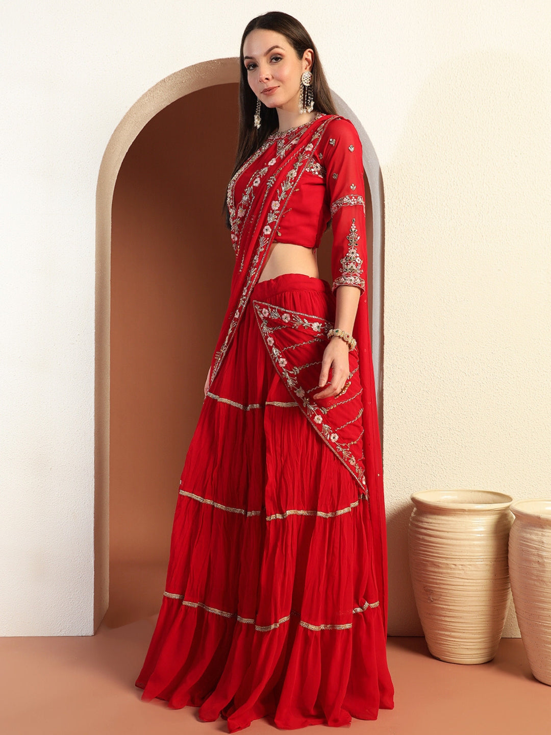 Mirror Work Tiered Lehenga with Embroidered Tasseled Choli & Attached Pre-Draped Dupatta