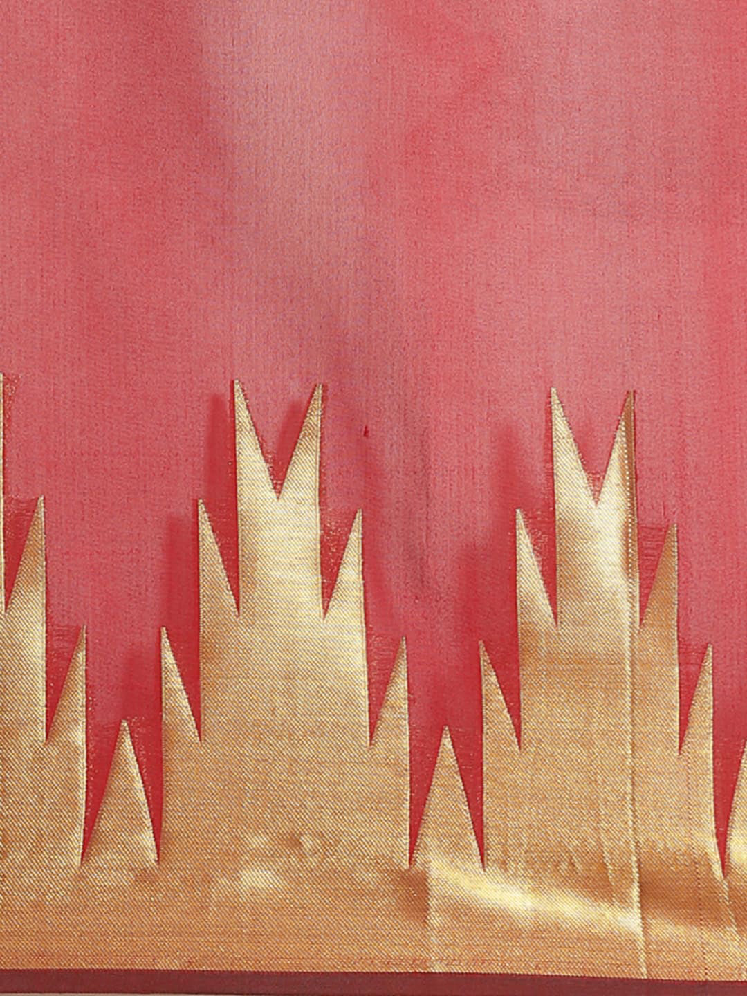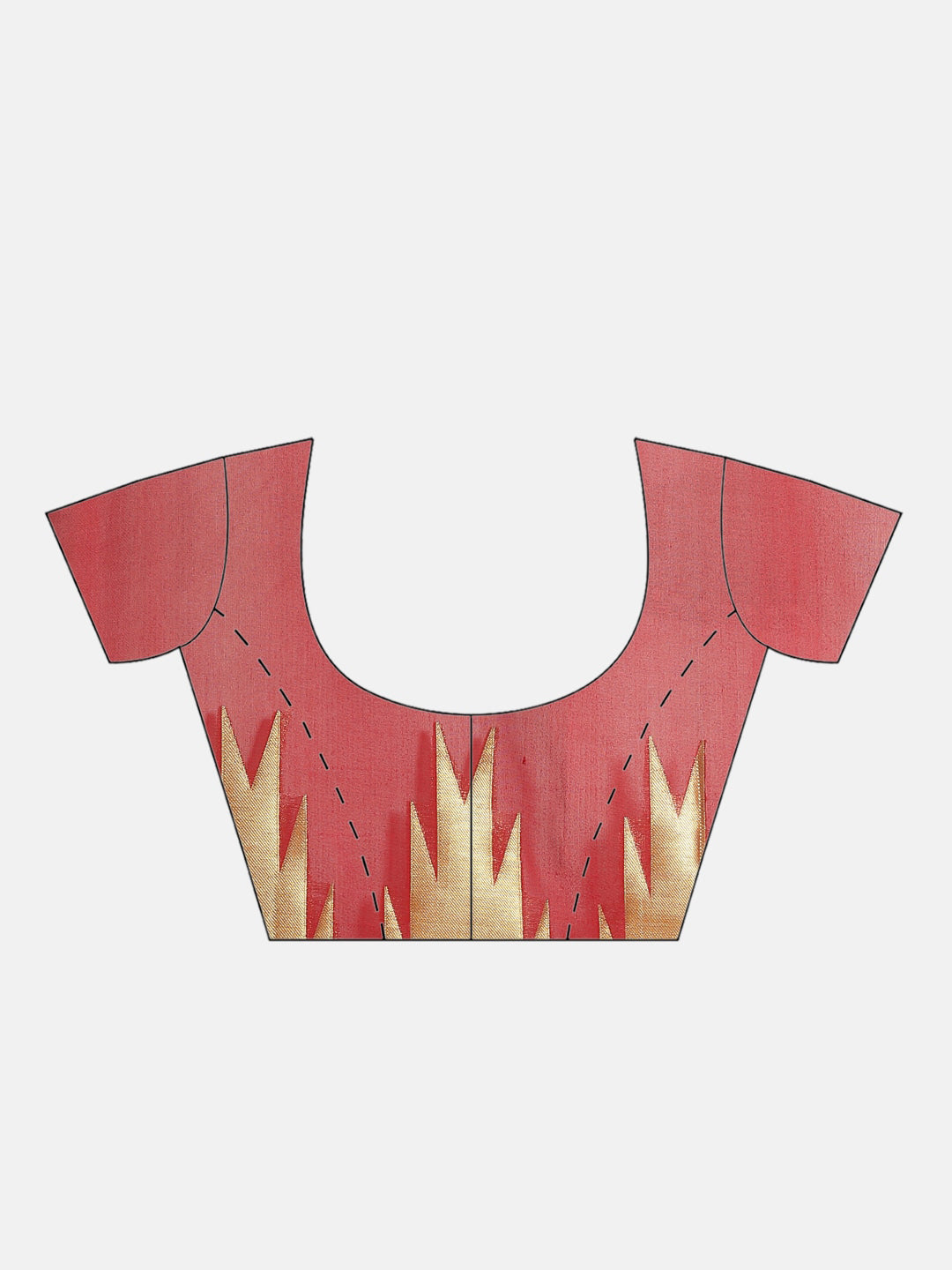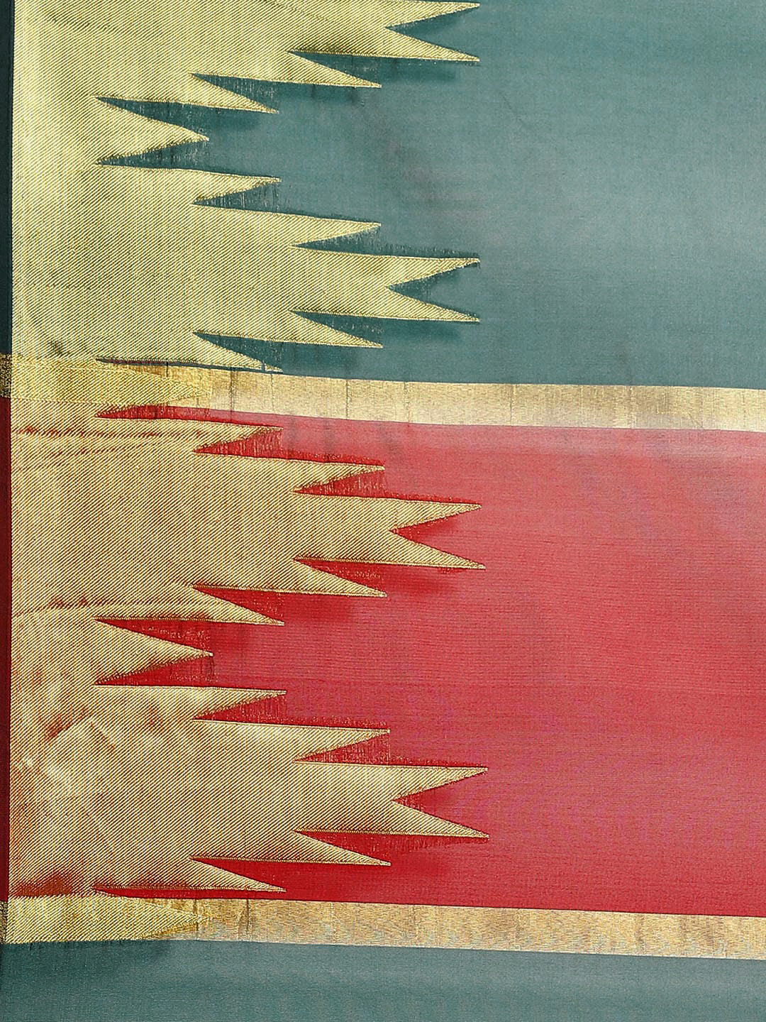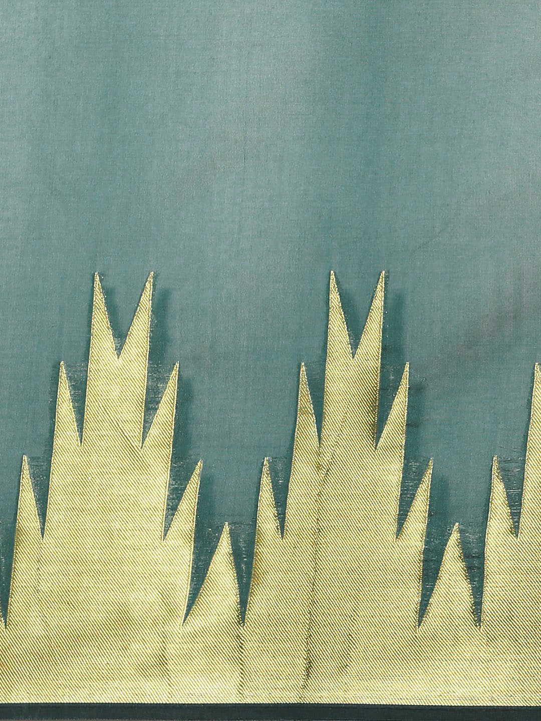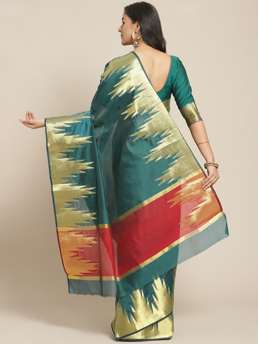 Banarasi Handloom Teal Saree with Gold Zari Temple Border & Contrast Maroon Blouse