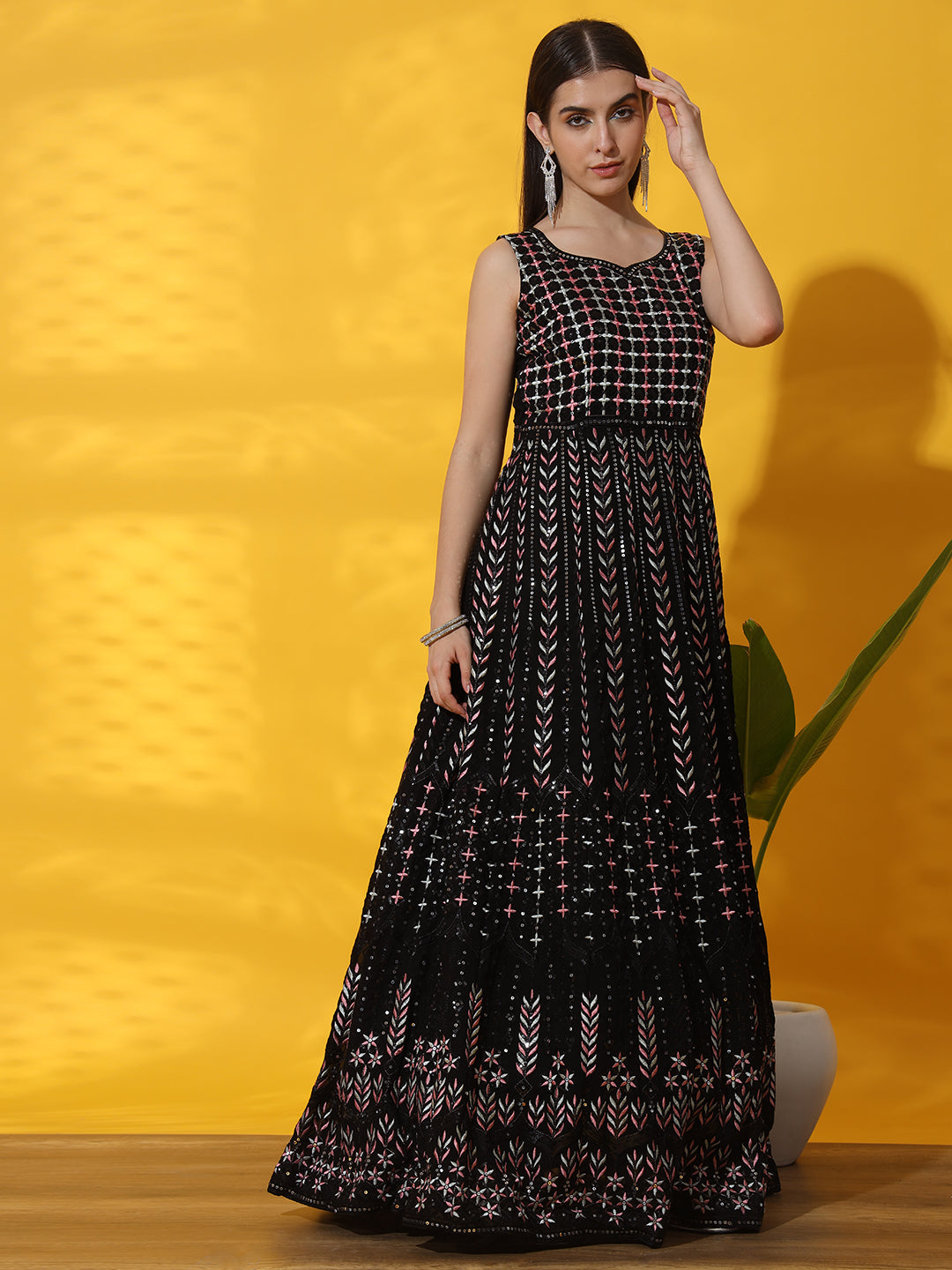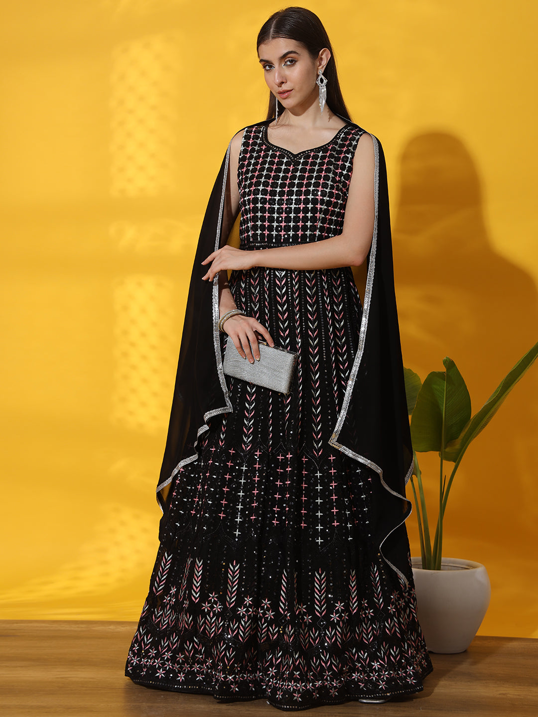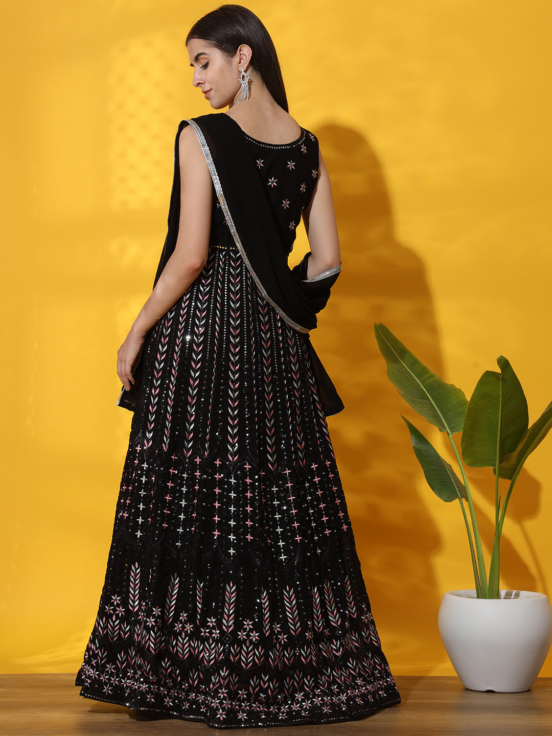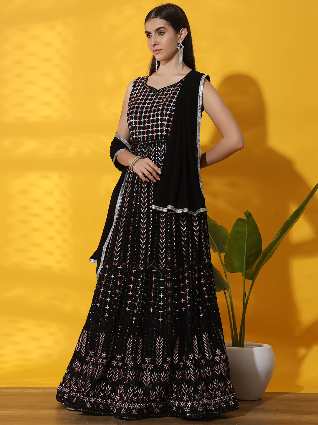 Black Multicolor Georgette Anarkali Gown with Crystal Embellishments