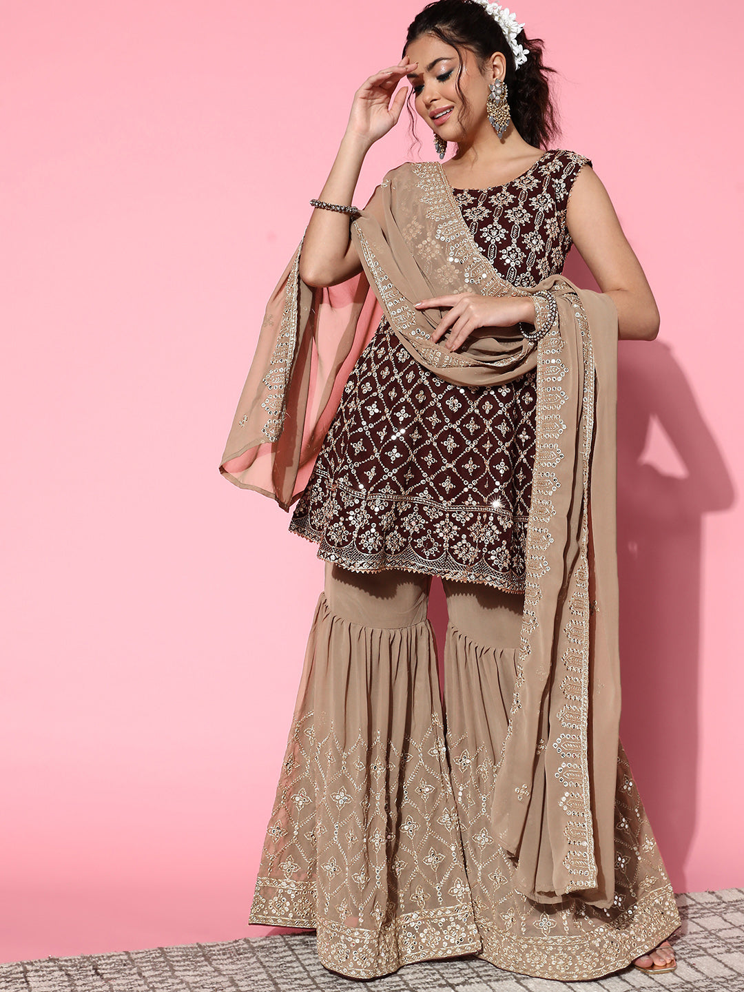 Colorblocked Sequin & Zari Embroidered Peplum Kurta Sharara Set