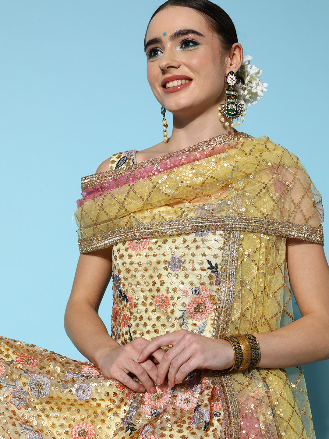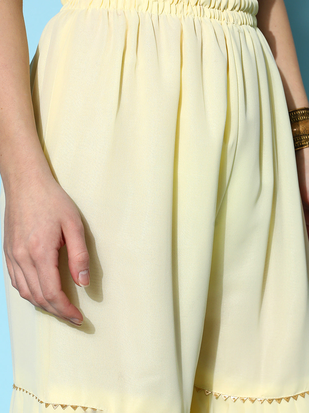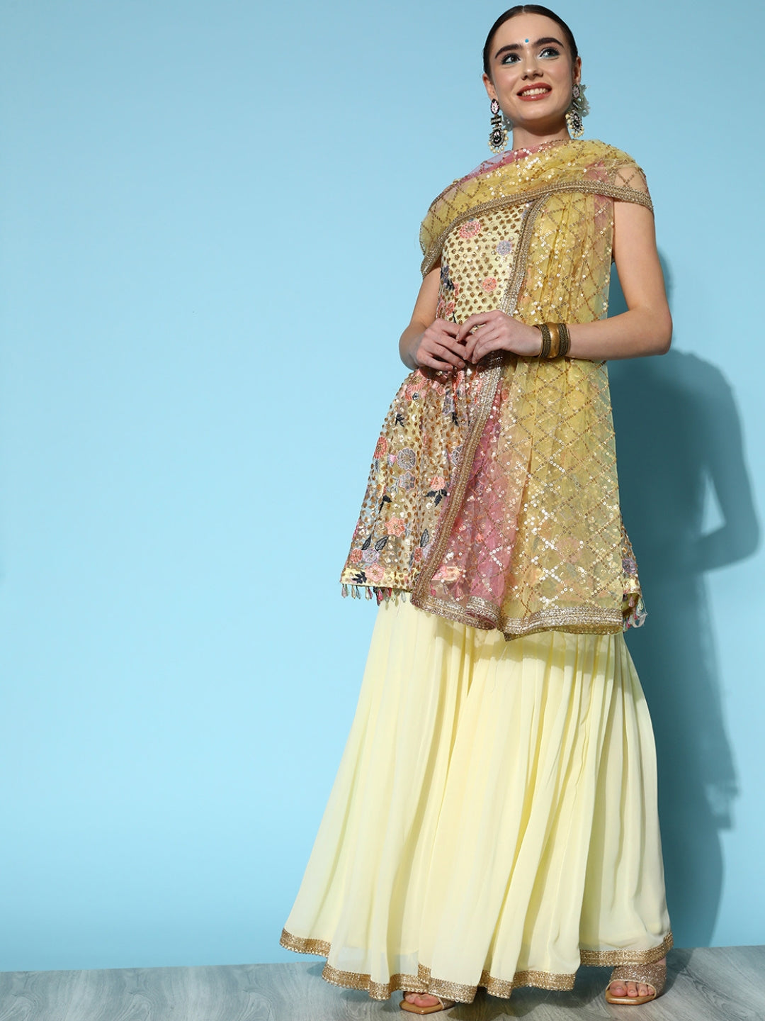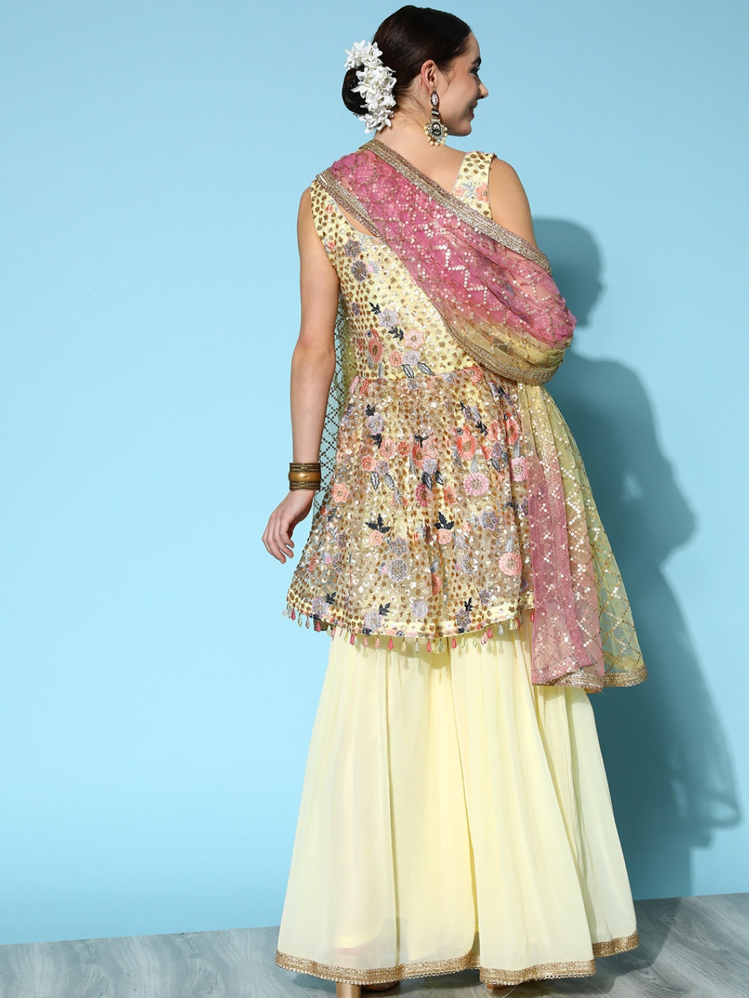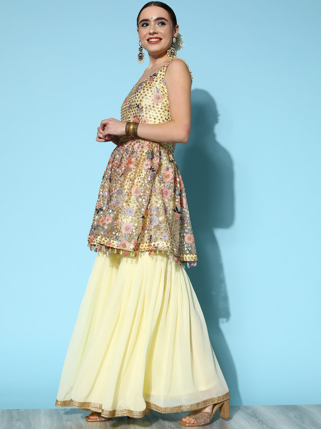 Pale Yellow Sequin & Resham Floral Embroidered Peplum Sharara Set