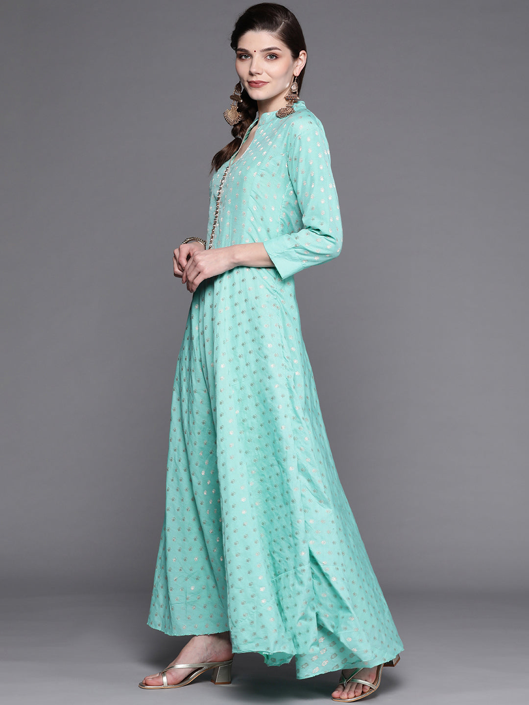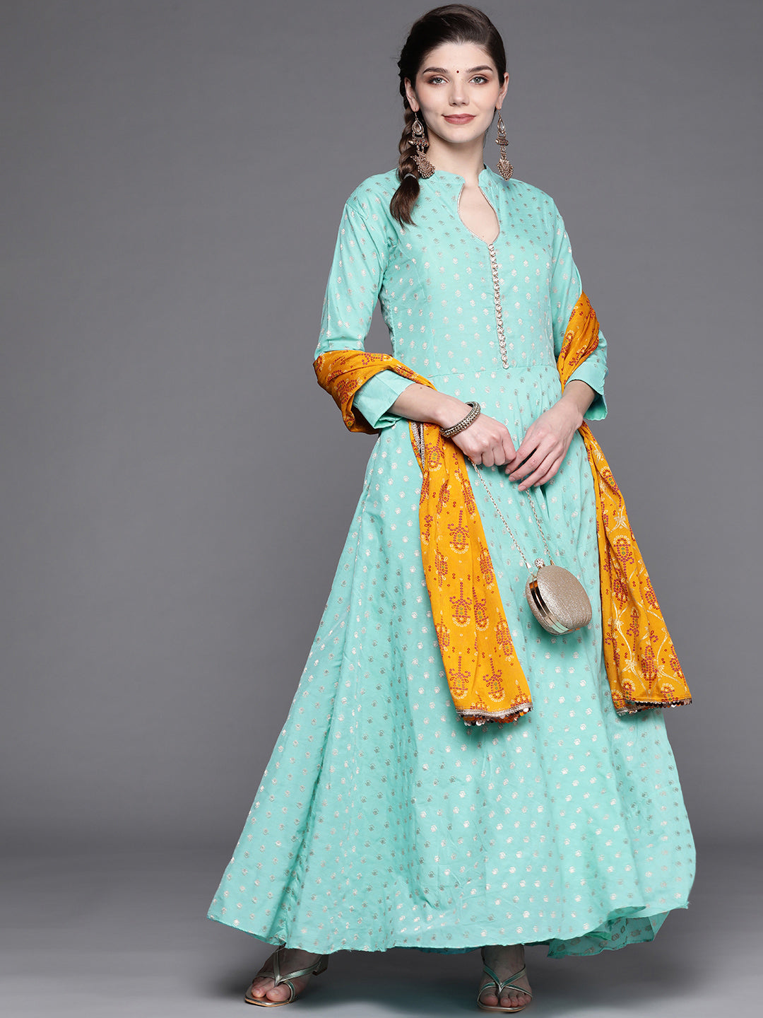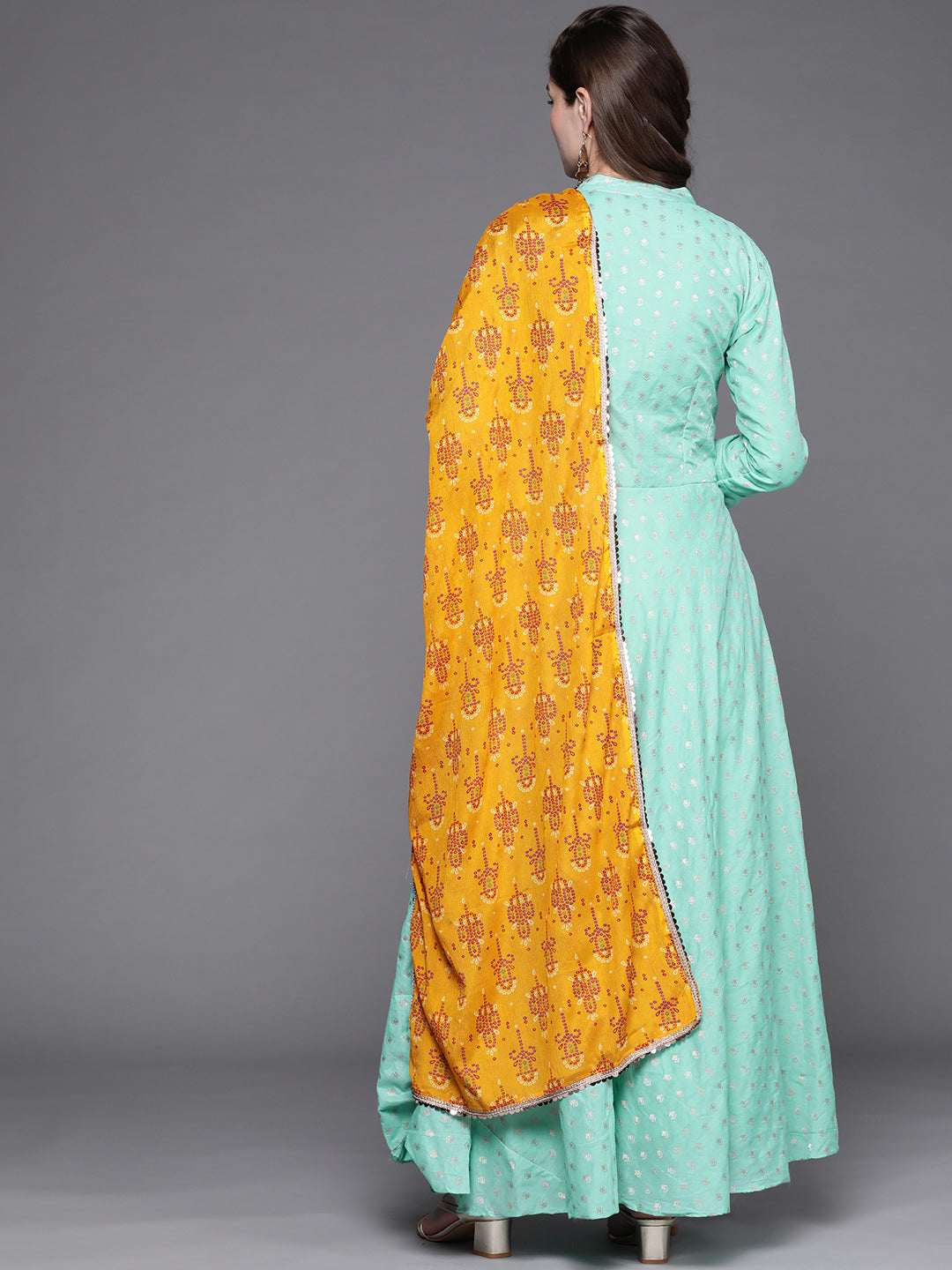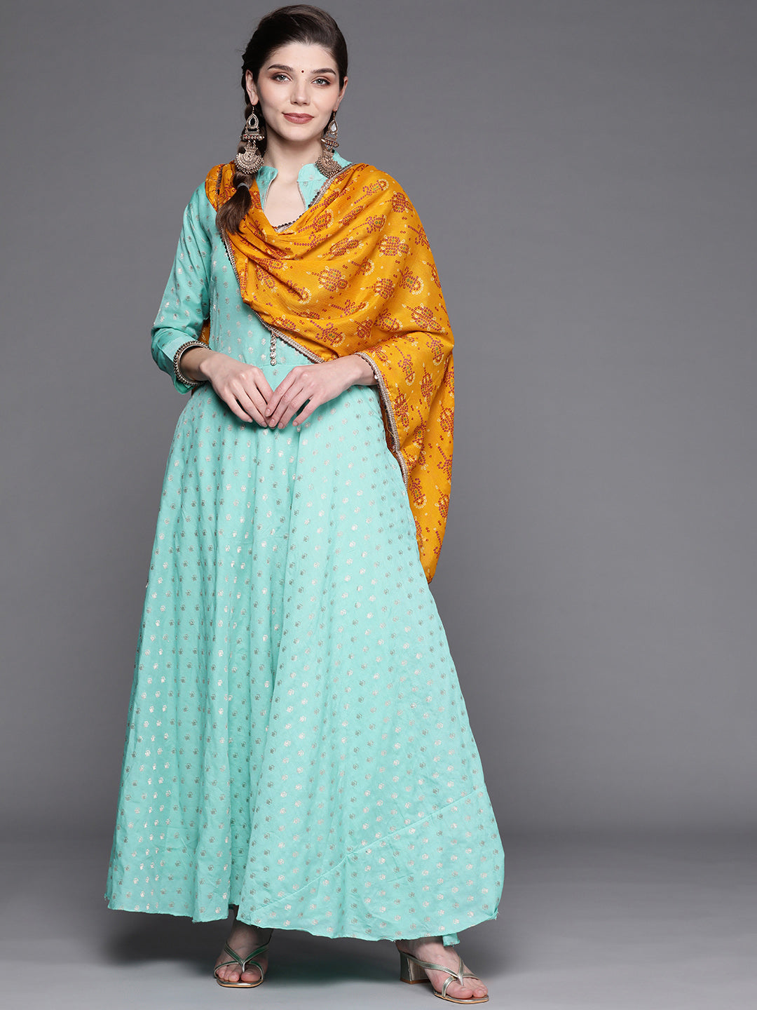 Turquoise Blue Banarasi Georgette Anarkali Suit & Mustard Bandhej Print Dupatta