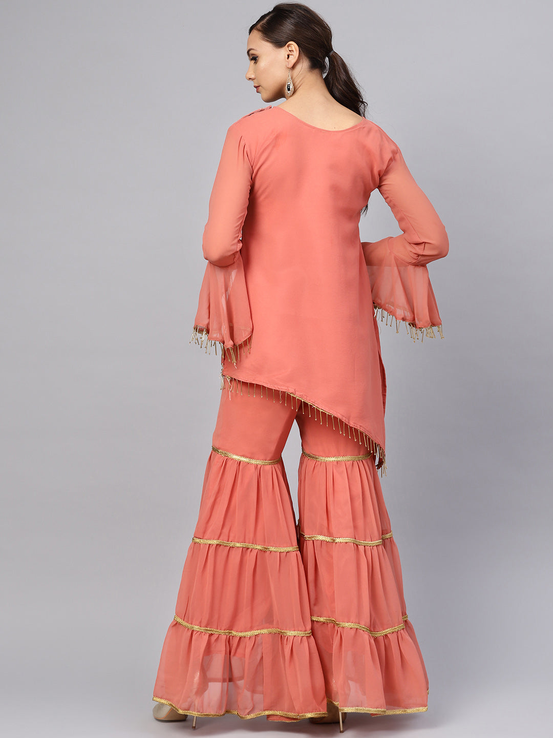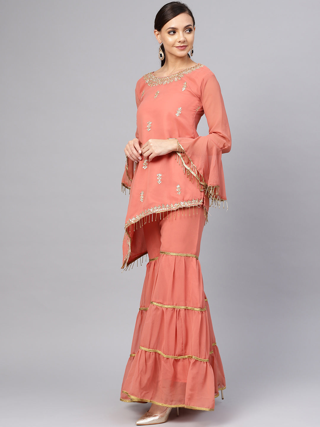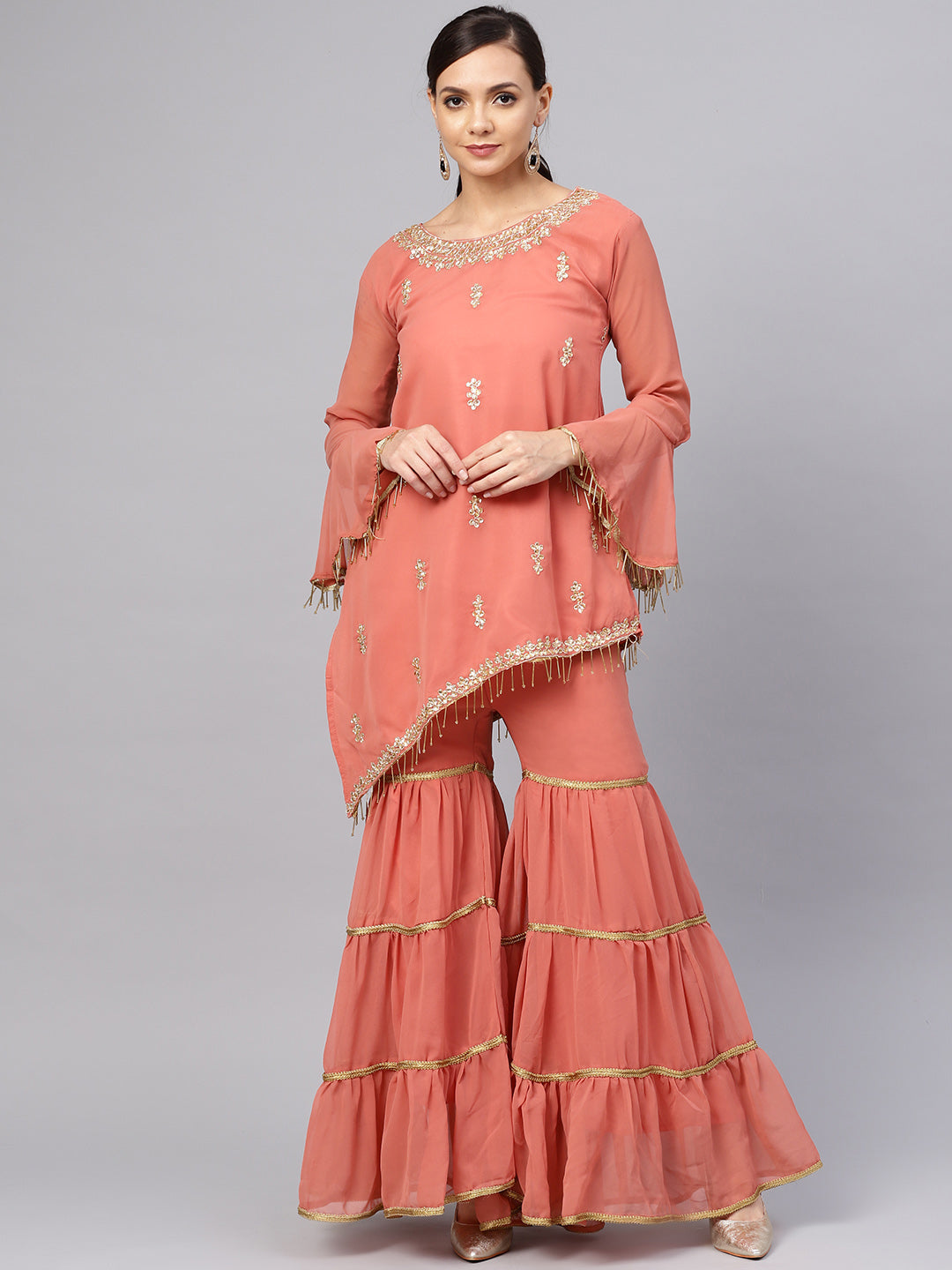 Kurta Sharara Set with Floral Zari Kundan Embroidery