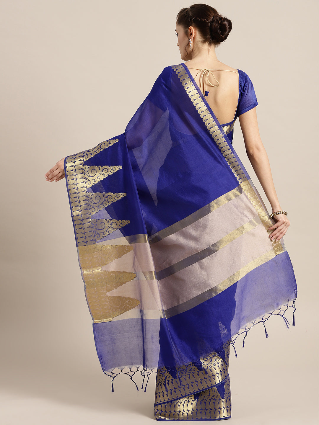 Chhabra 555 Blue Banarasi Handloom Silk Saree with Gold Temple pattern and Paisley border