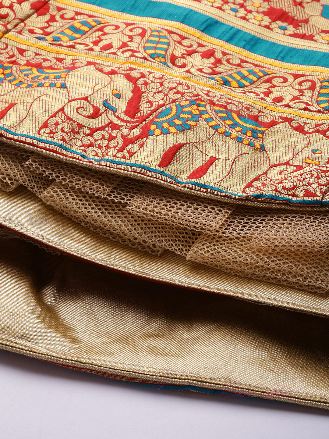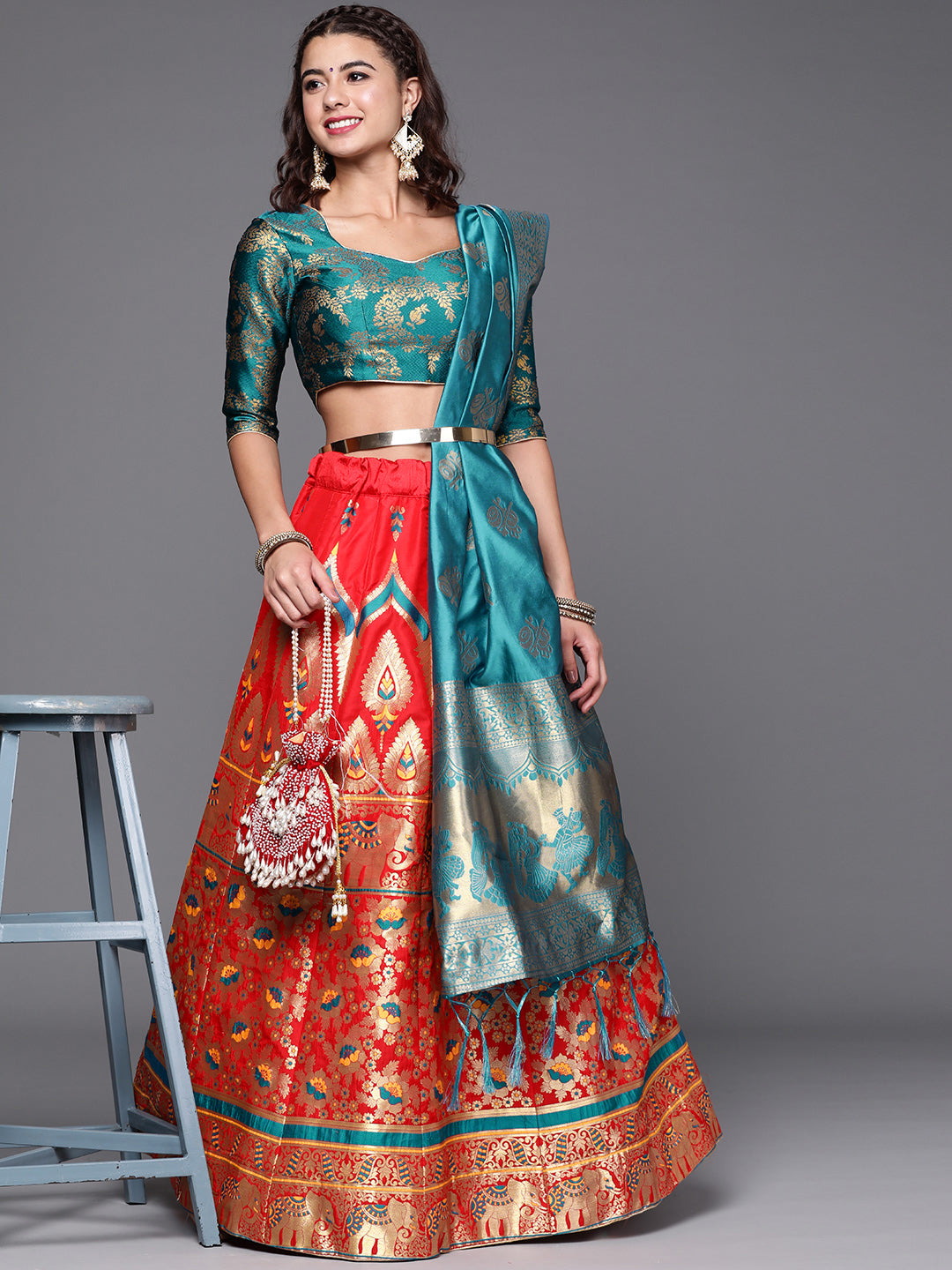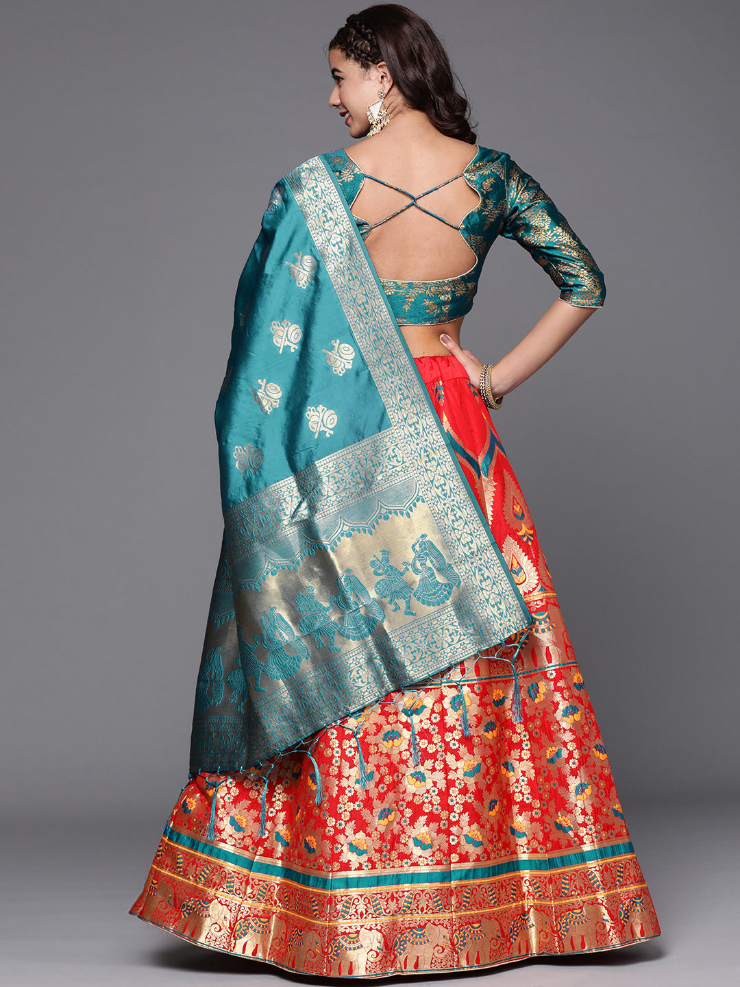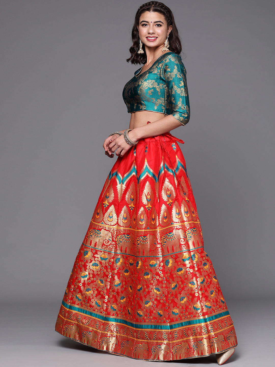 Red Semi Stitched Banarasi Brocade Silk Lehenga Set with Floral Zari, Meenakari Weaving