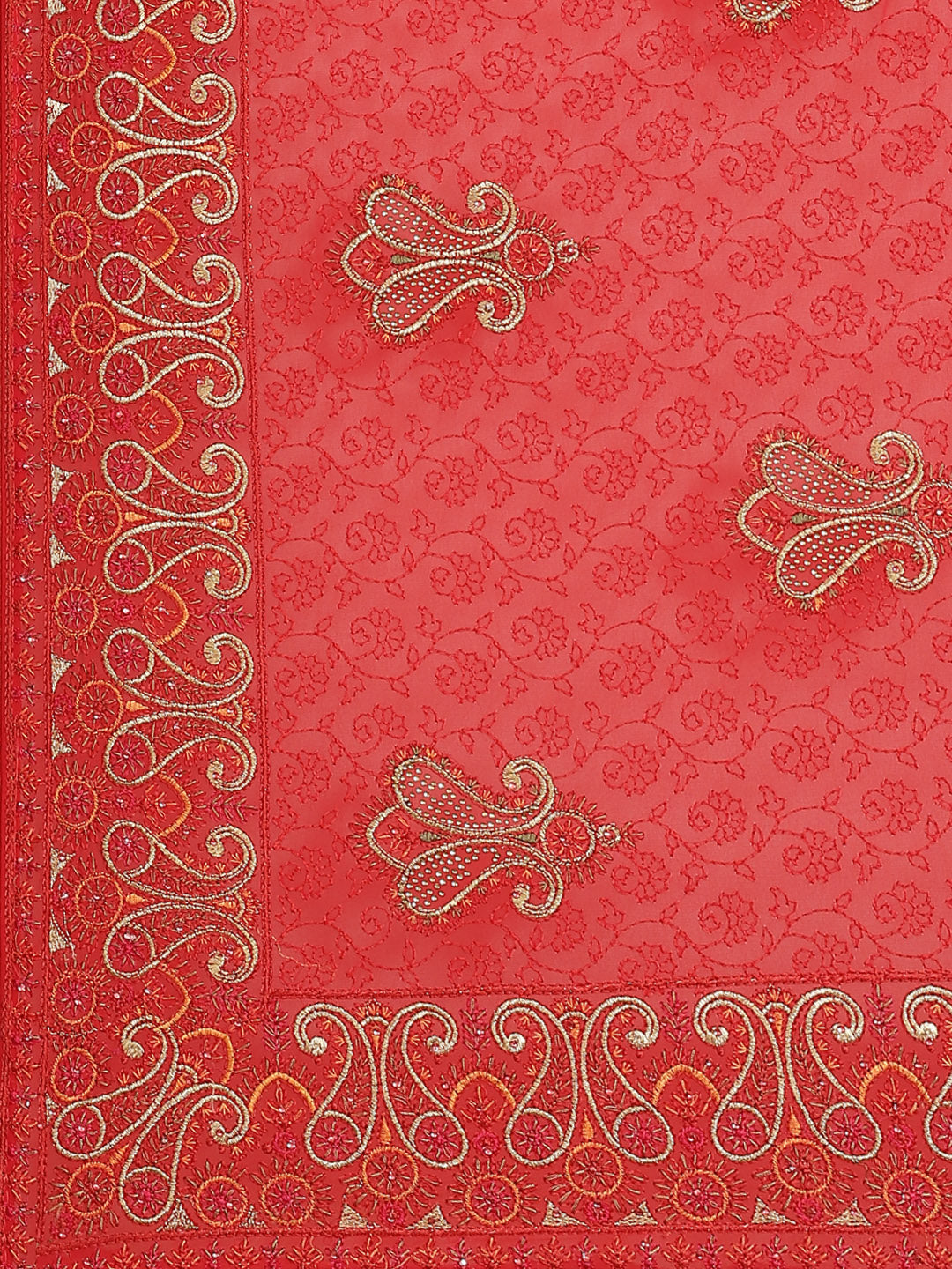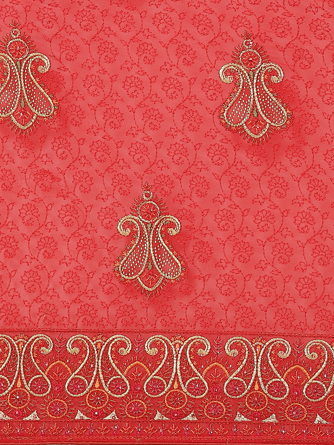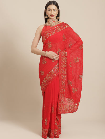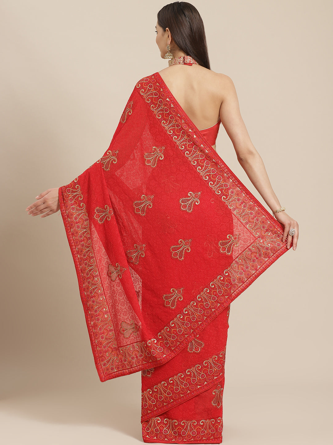 Red Georgette Heavy Resham Embroidery Saree With Gold Intricate Paisley Motifs & Swarovski Crystals