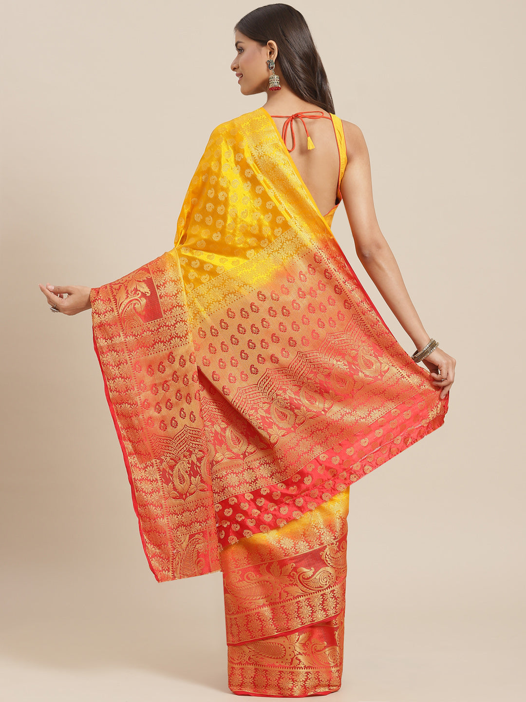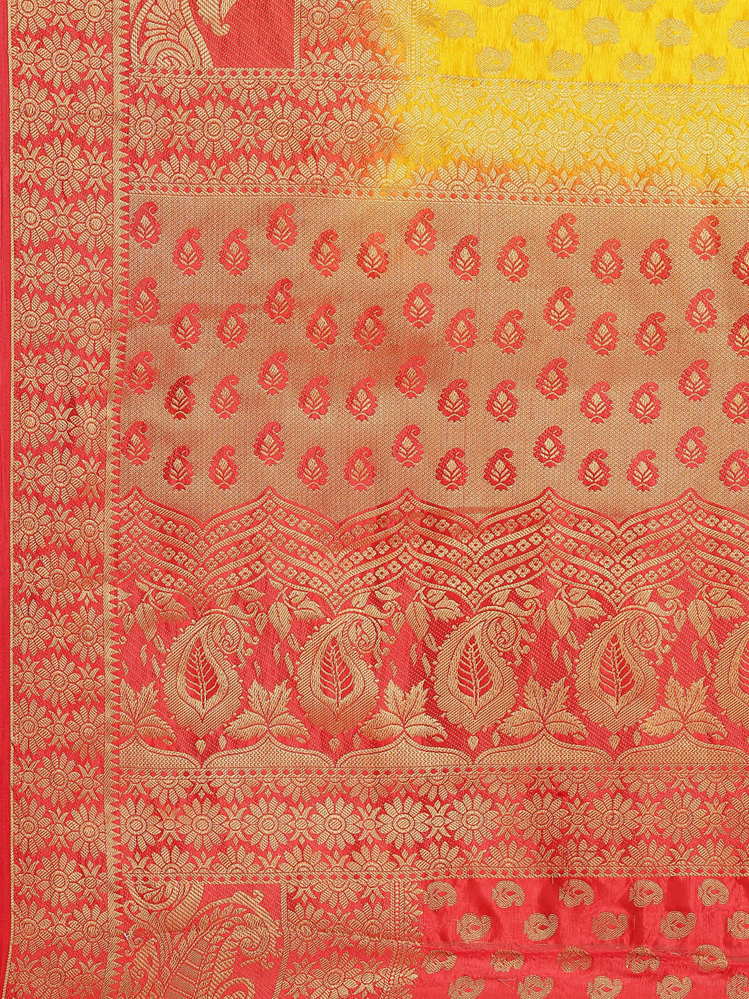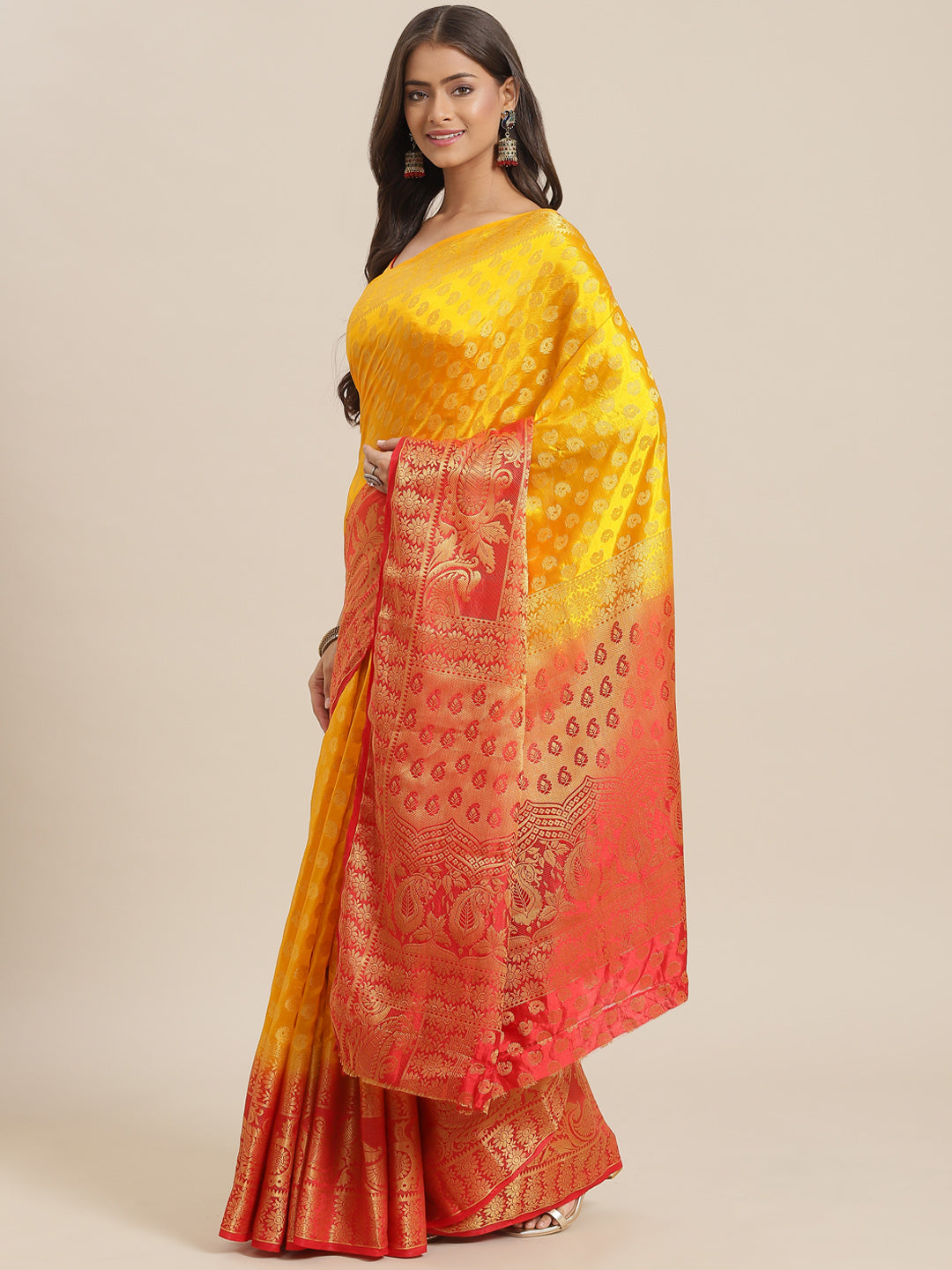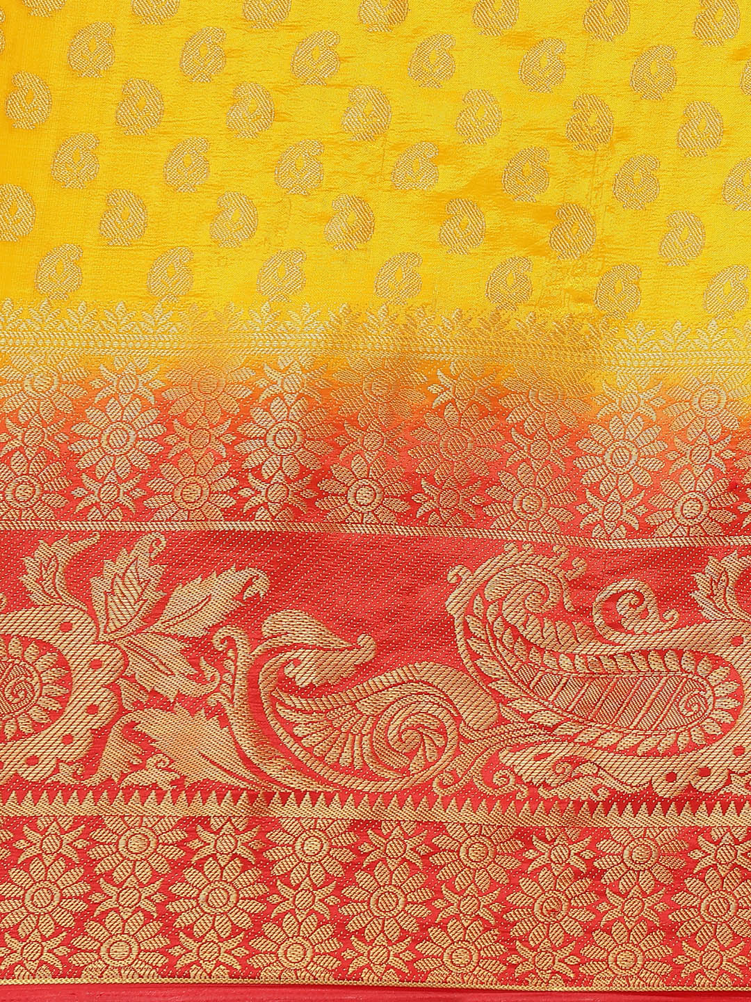 Yellow to Red Ombre Banarasi Georgette Saree With Contrast Blouse