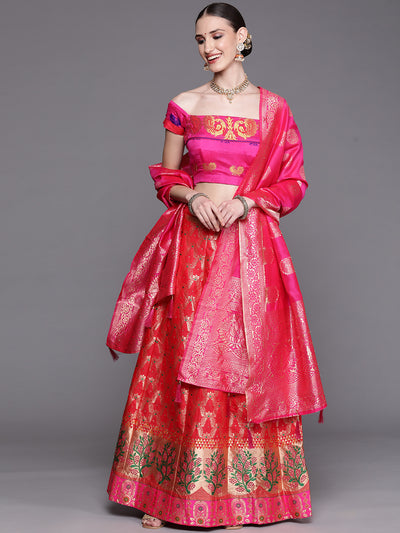 Chhabra 555 Semi-Stitched Red Zari & Resham Handwoven Banarasi Brocade Floral Lehenga Set & Beads