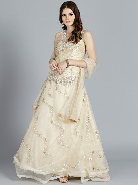 Chhabra 555 Cream Pearl Embellished Resham Embroidered Kurta Set making beautiful floral patterns