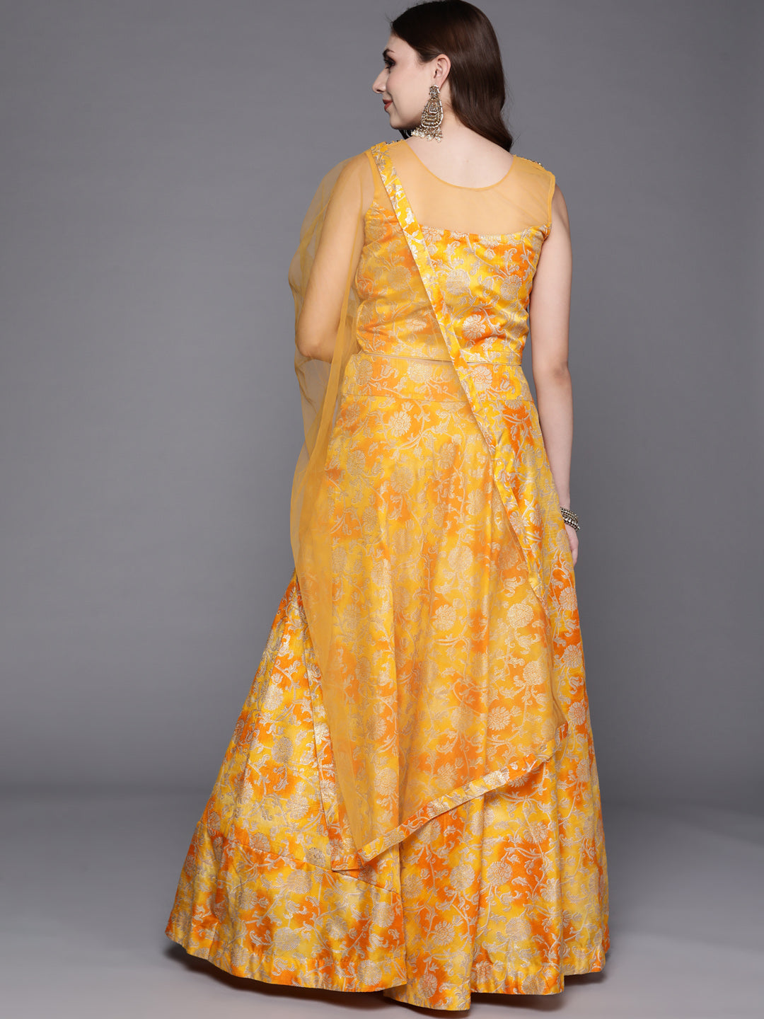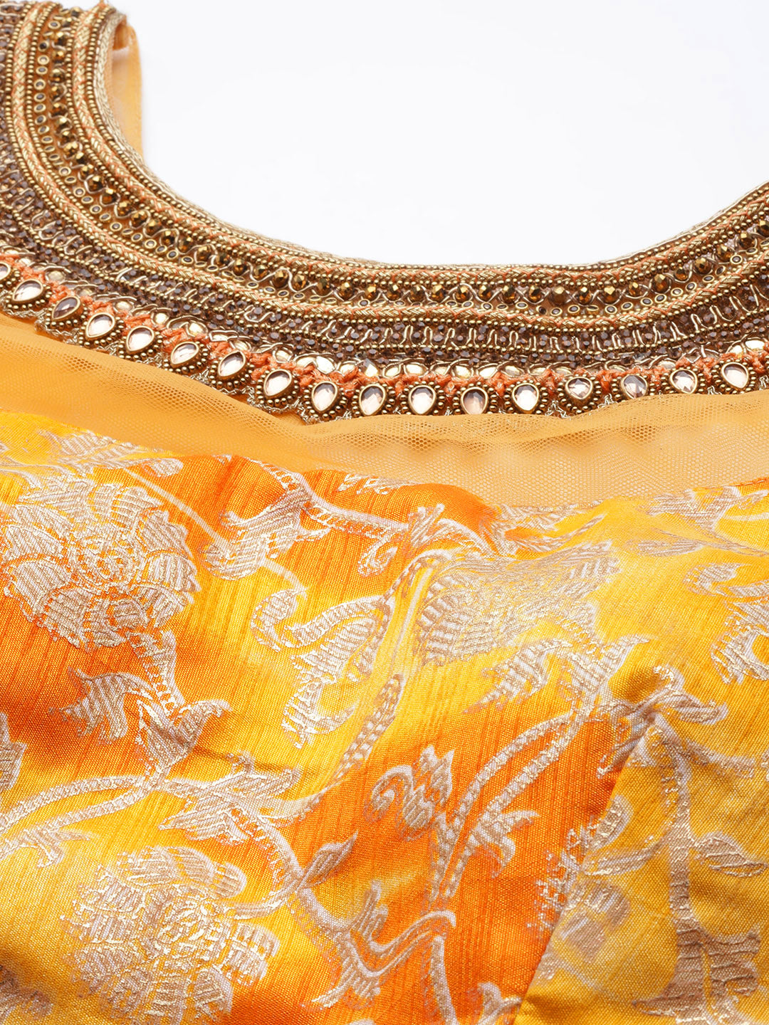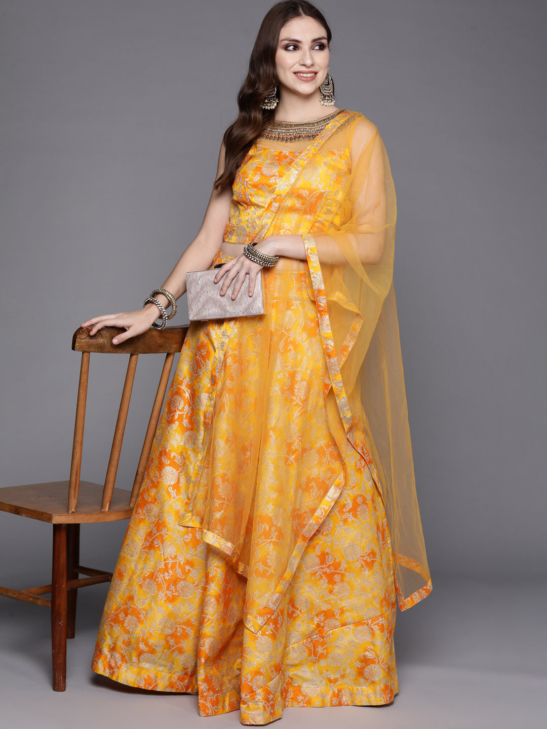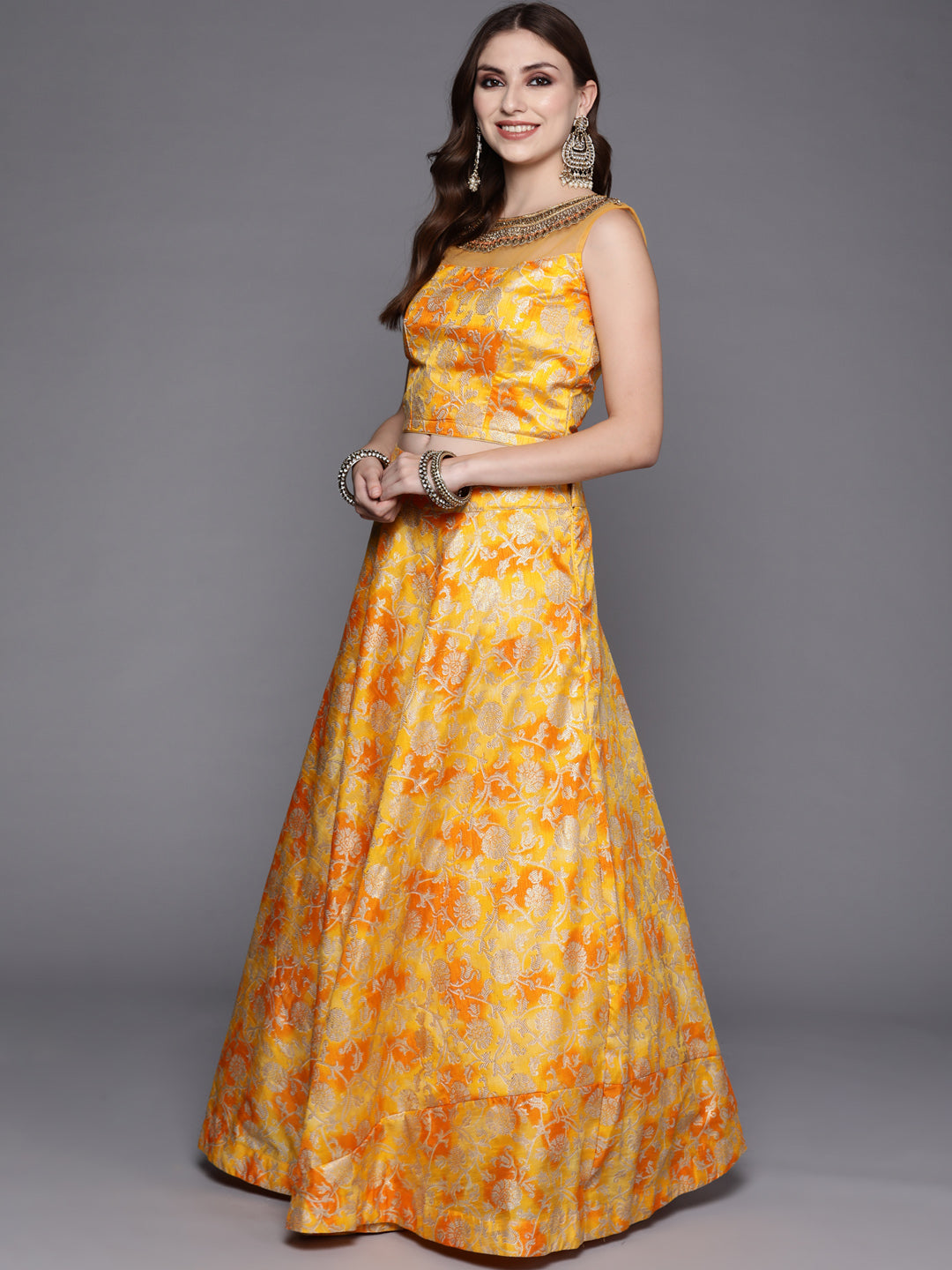 Mustard Floral Printed Silk Lehenga Set & Embellished Neckline