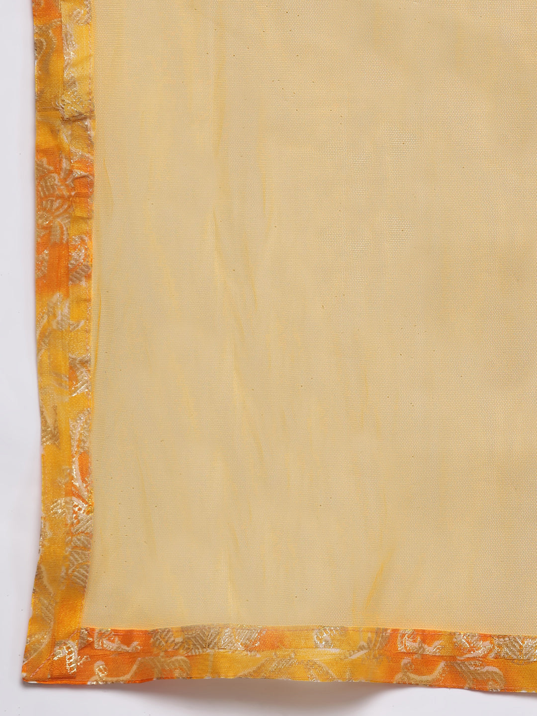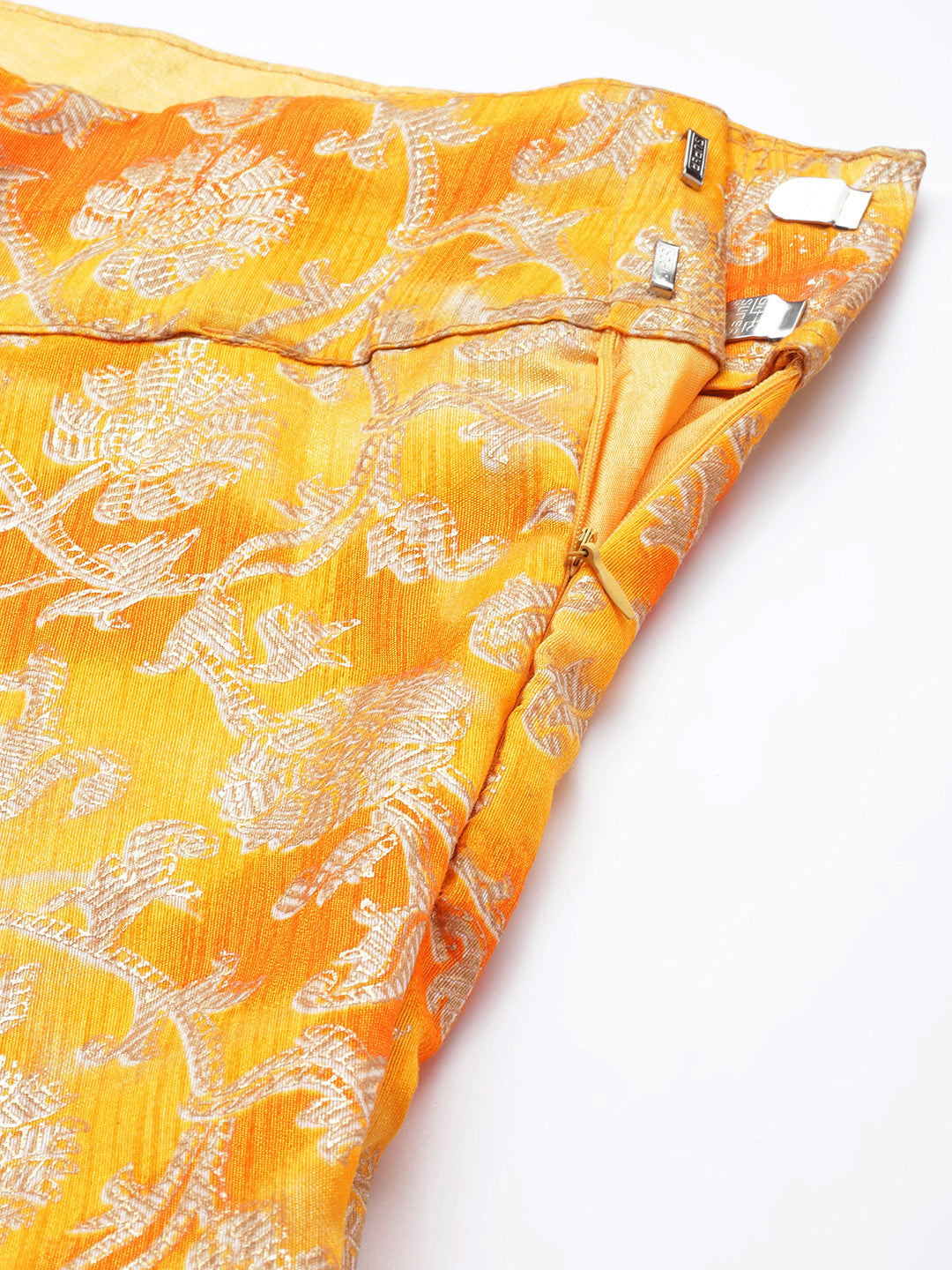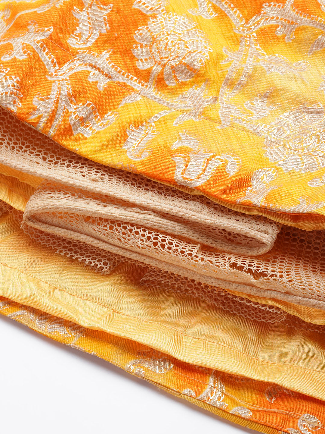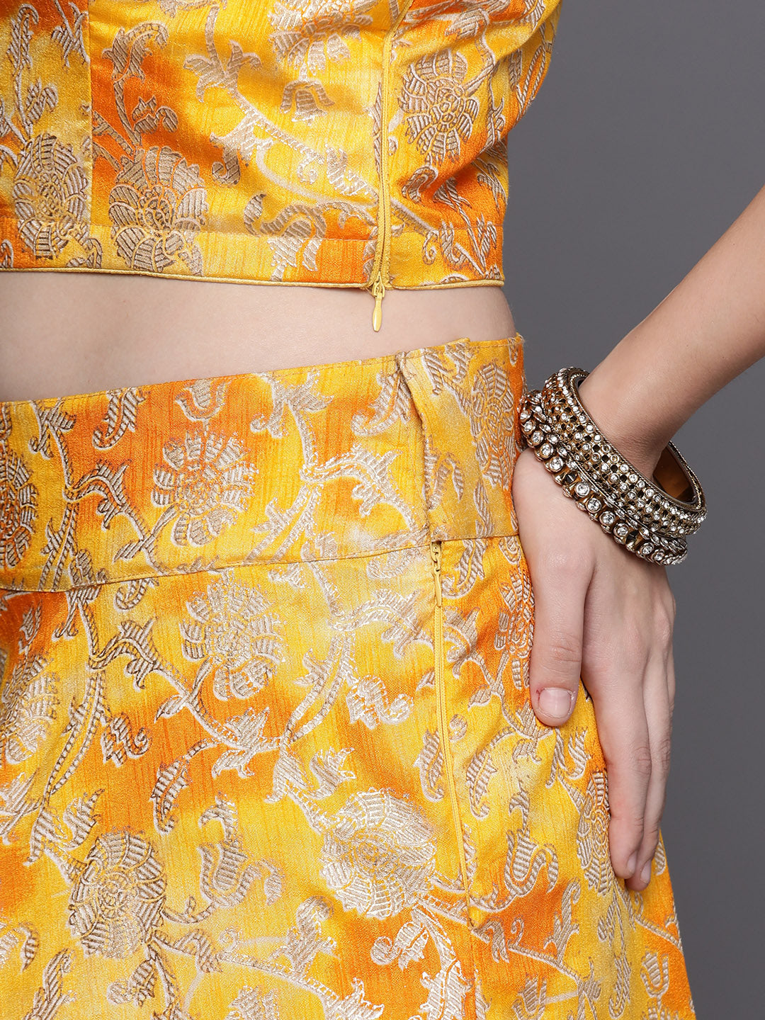 Mustard Floral Printed Silk Lehenga Set & Embellished Neckline