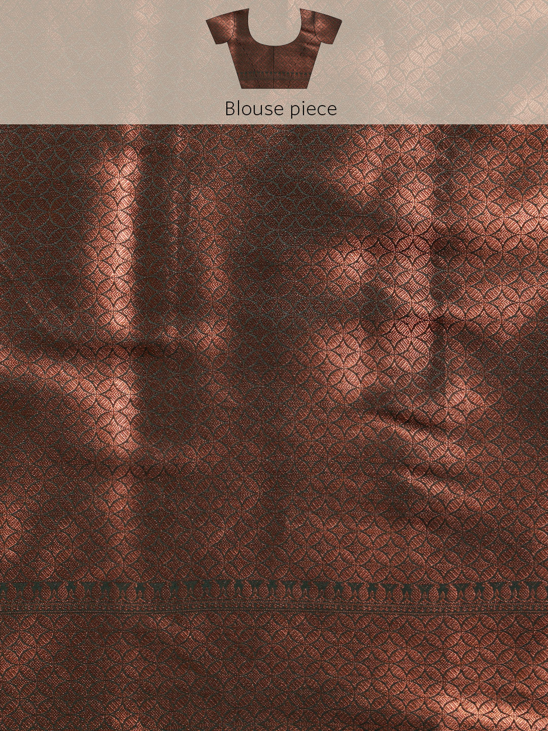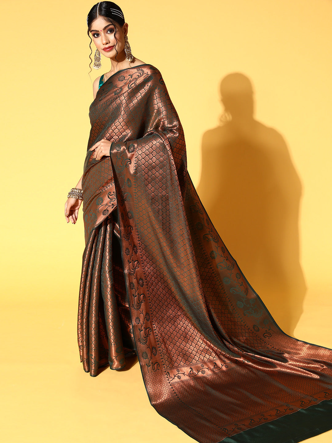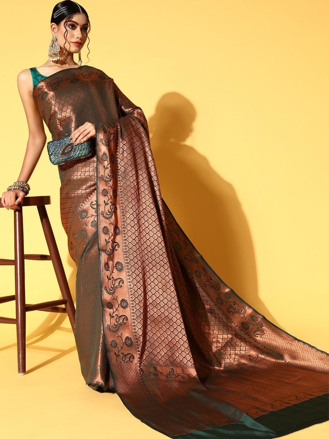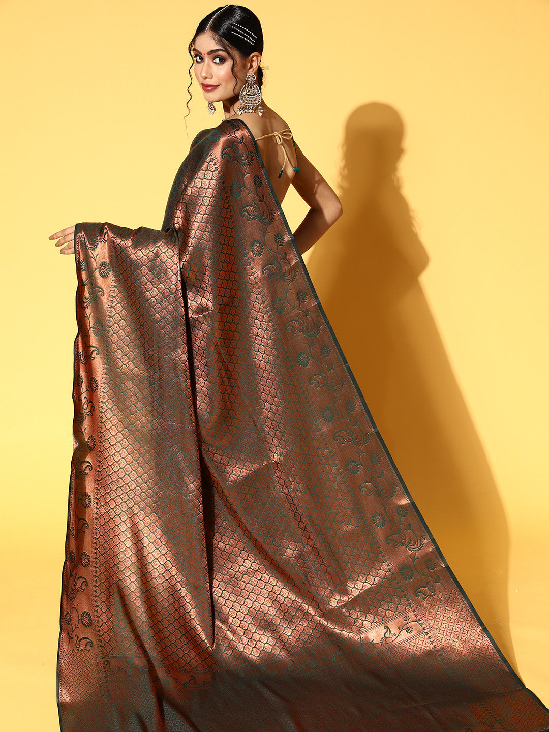 Bottle Green Oxidised Zari Handloom Silk Saree With Ethnic Motifs
