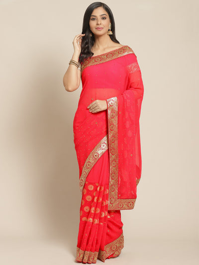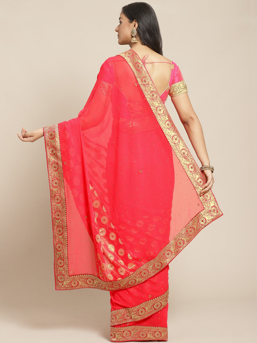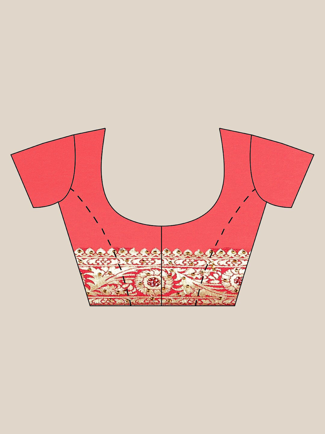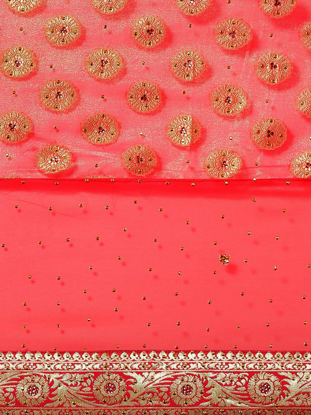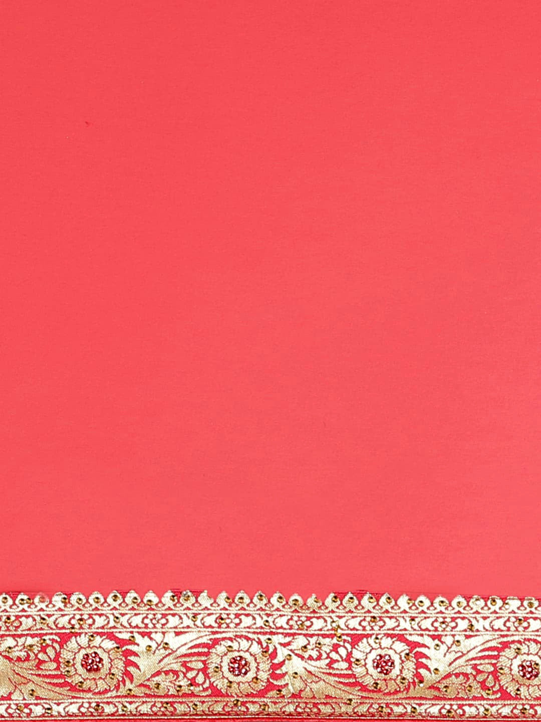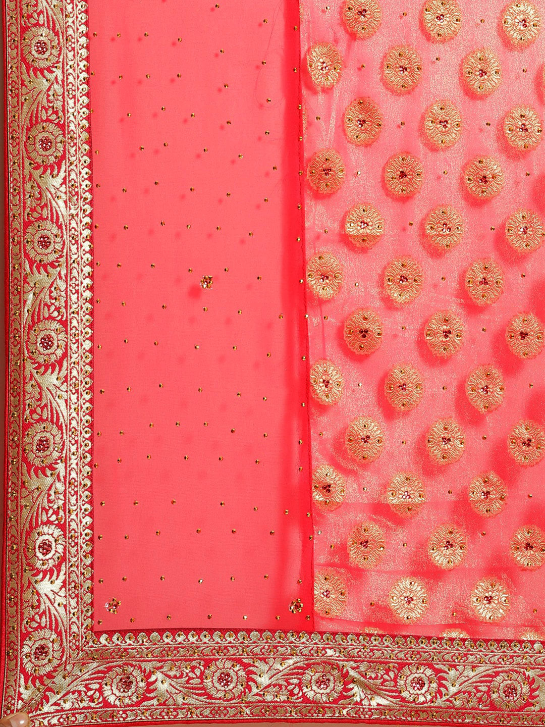Coral Pink Embellished Georgette Saree with Banarasi Brocade Woven Border