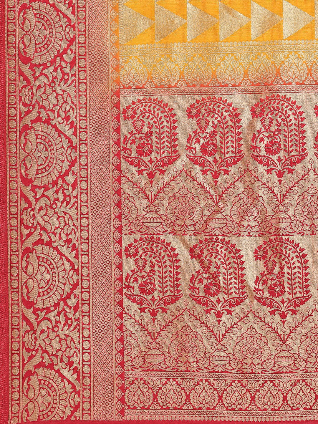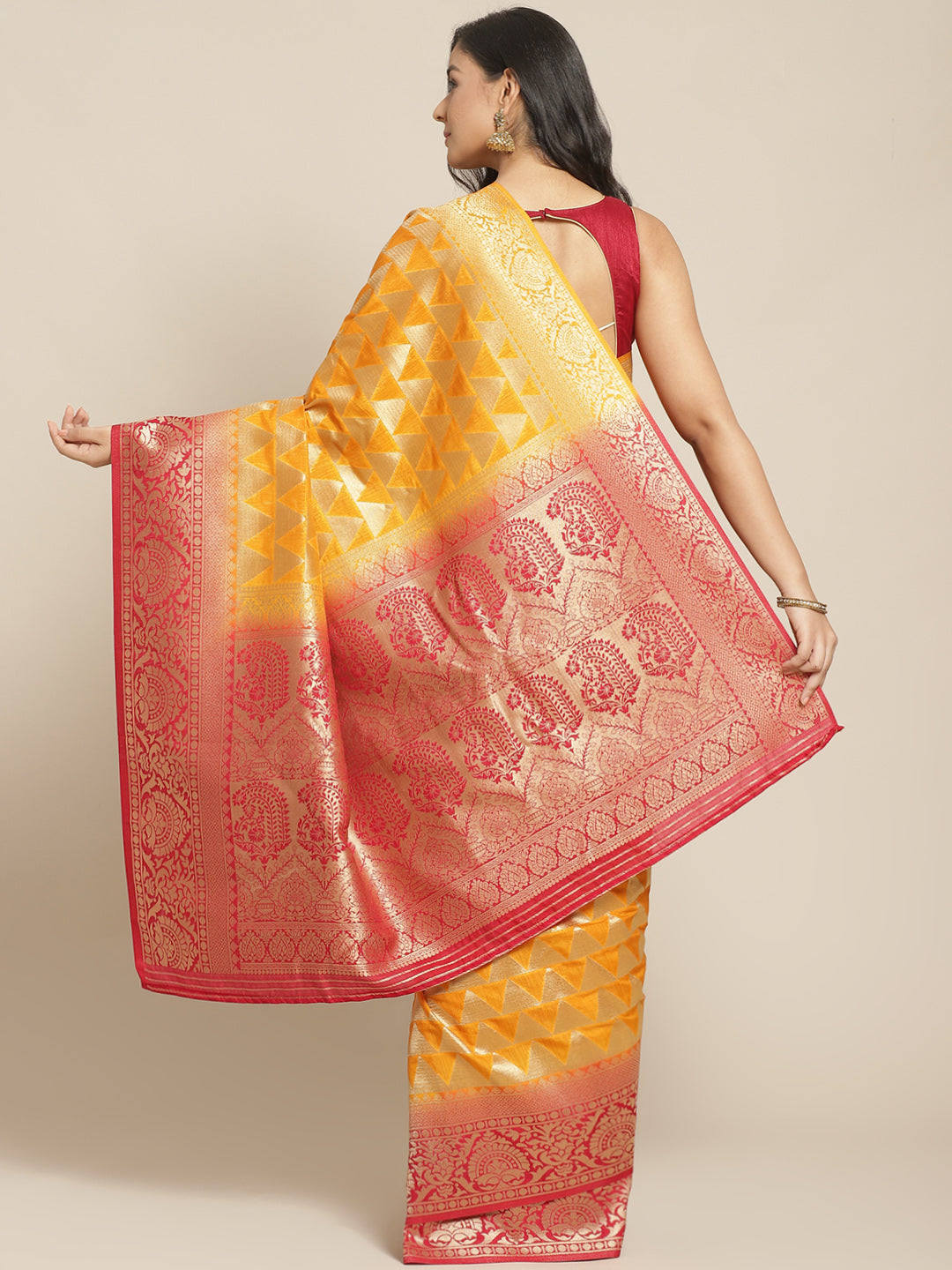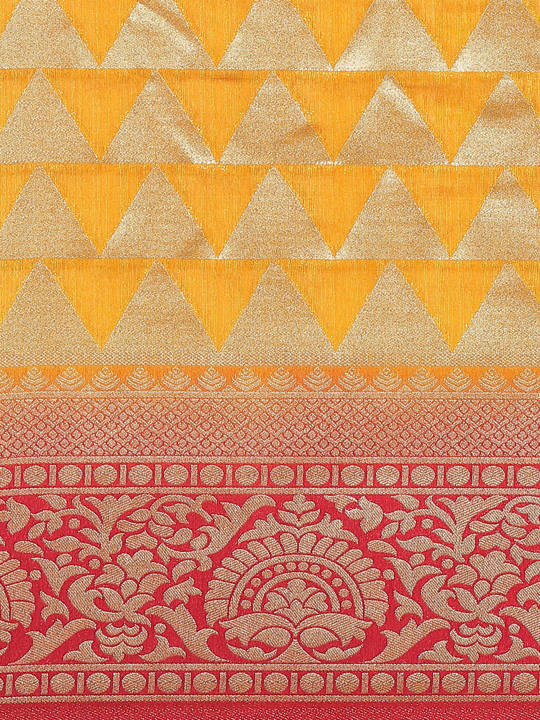 Mustard Banarasi Handloom Woven Saree in Geometrical Pattern & Ethnic Contrast Border