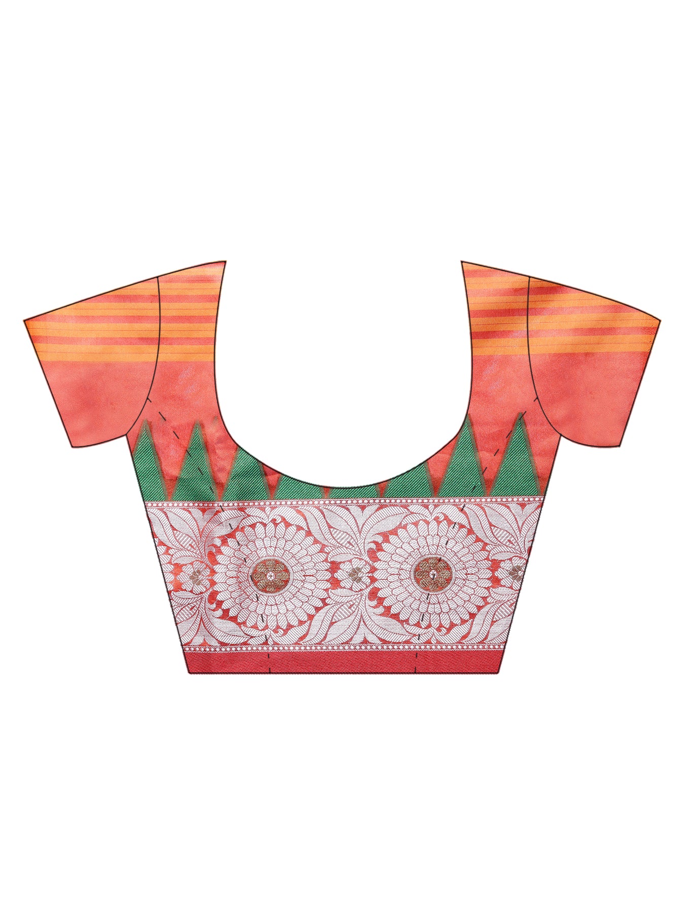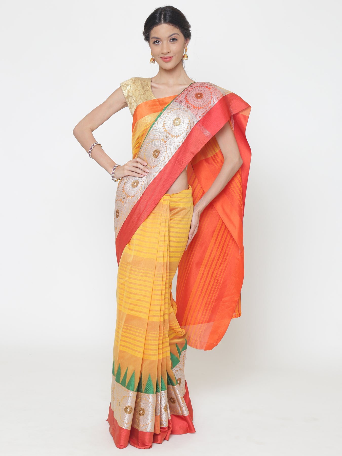 Orange and yellow Striped Handloom Banarasi Saree with contrast Green Temple border