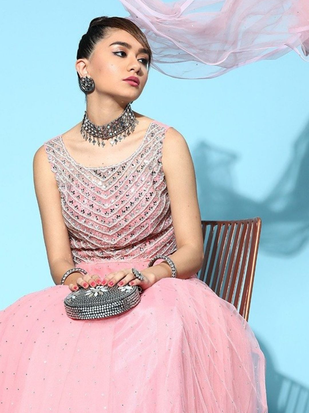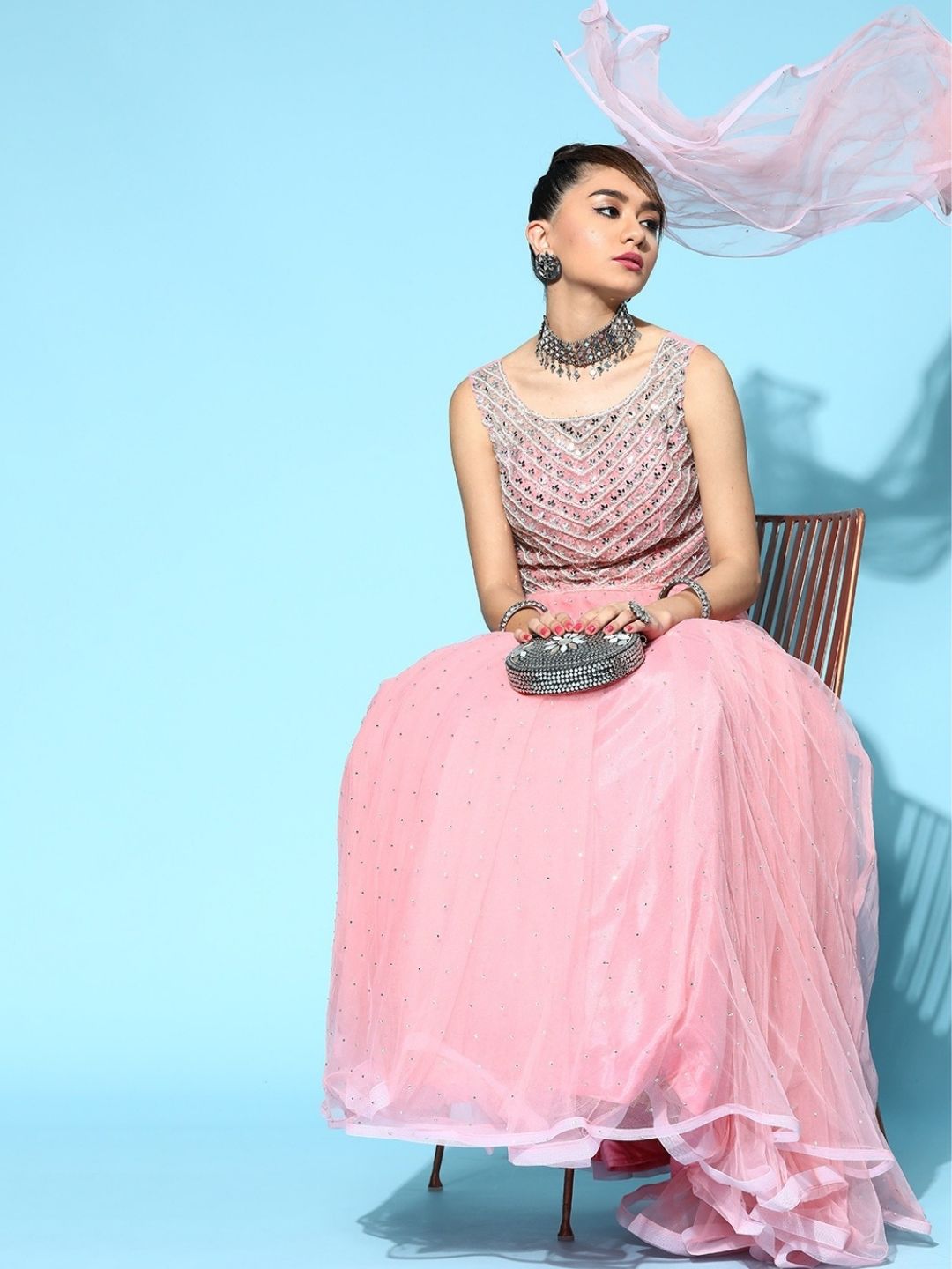 Made to Measure Pastel Pink Heavy Embellished Mirror & Pearls Net Flowing Lehenga Set