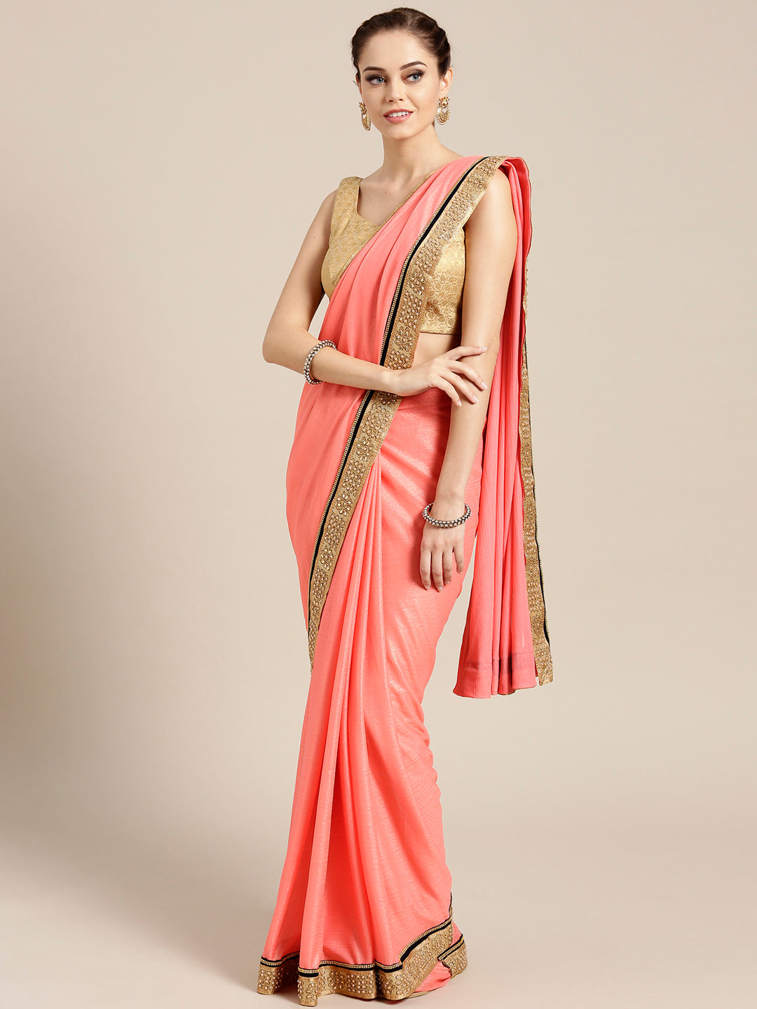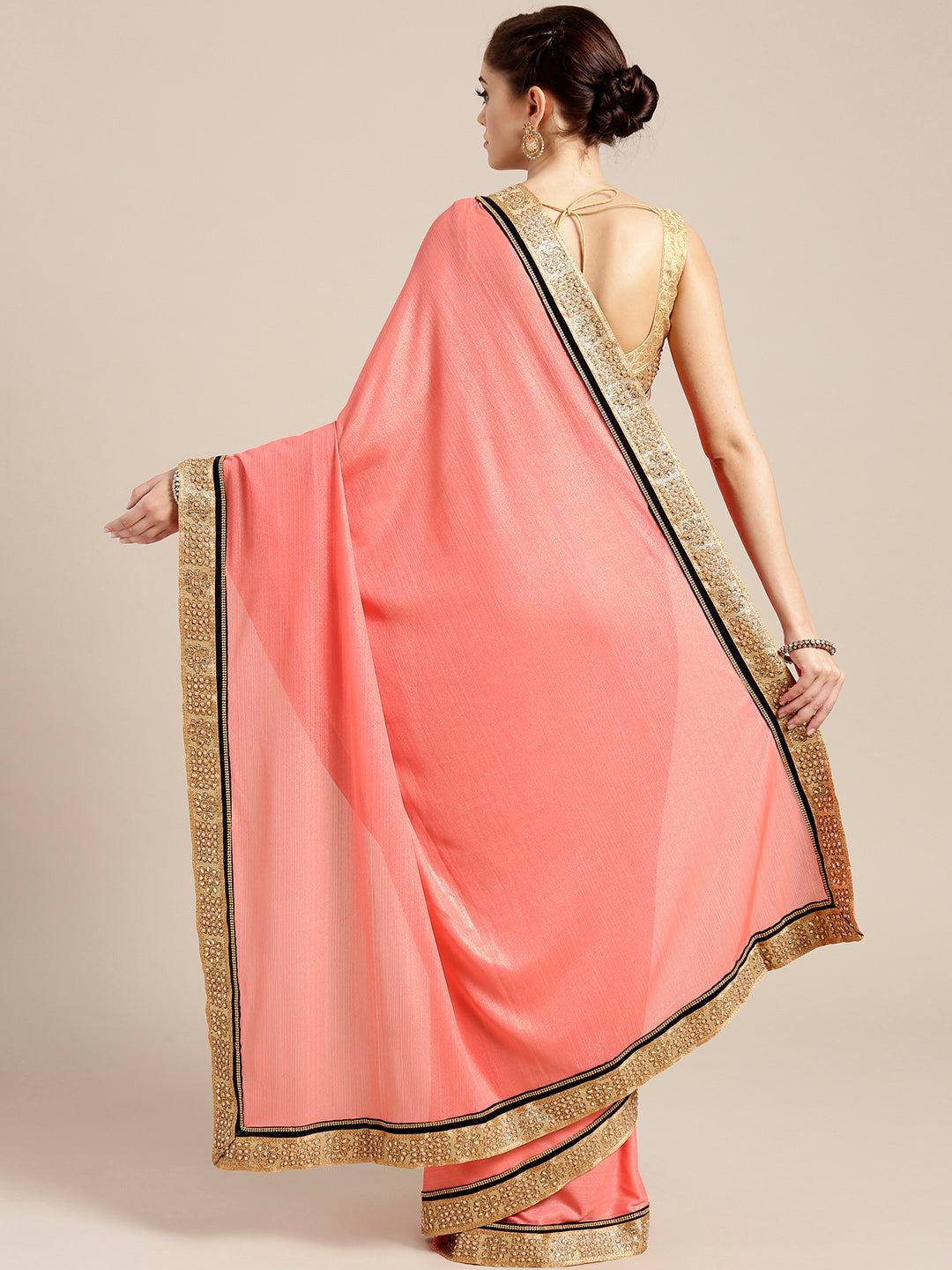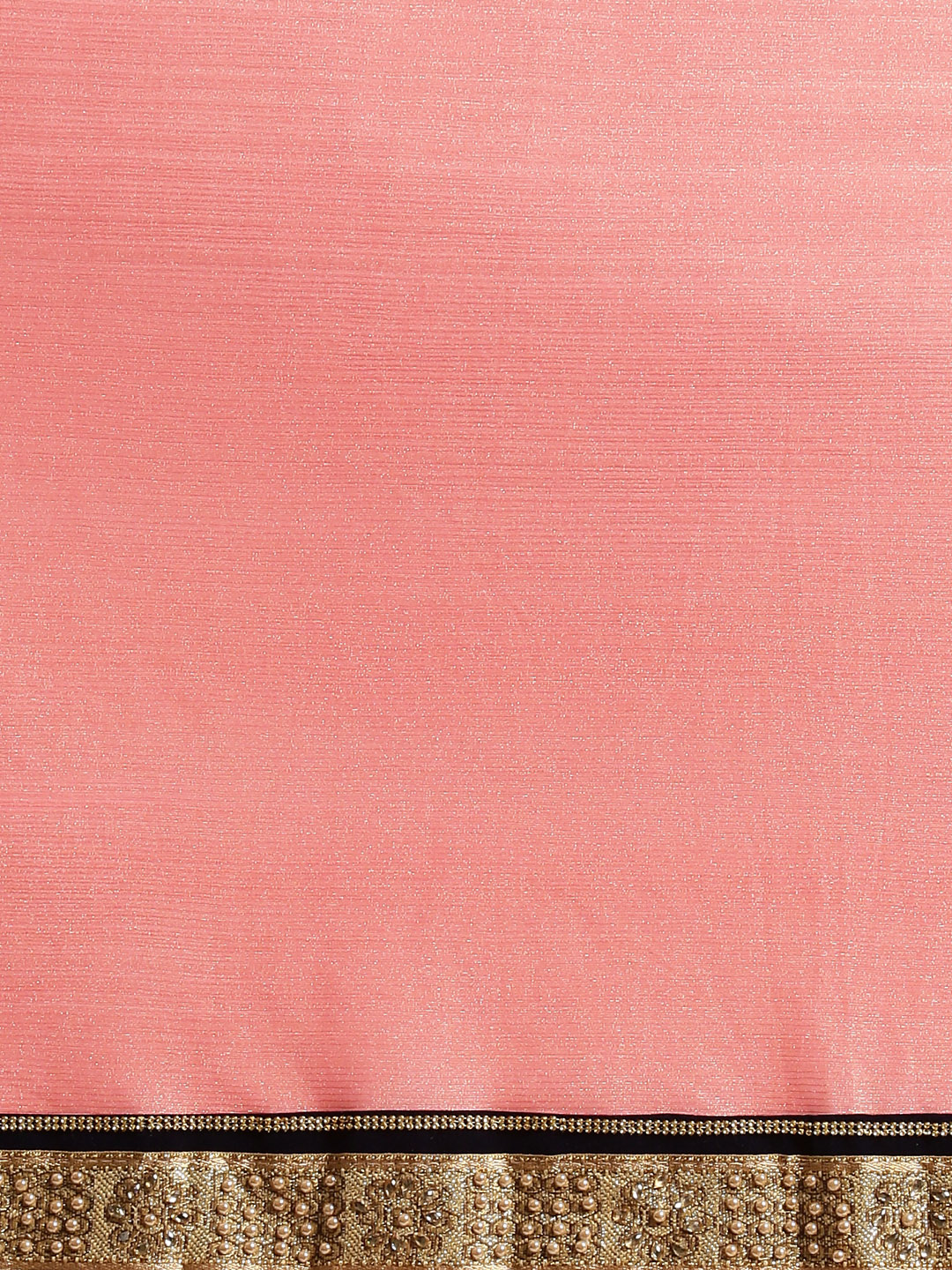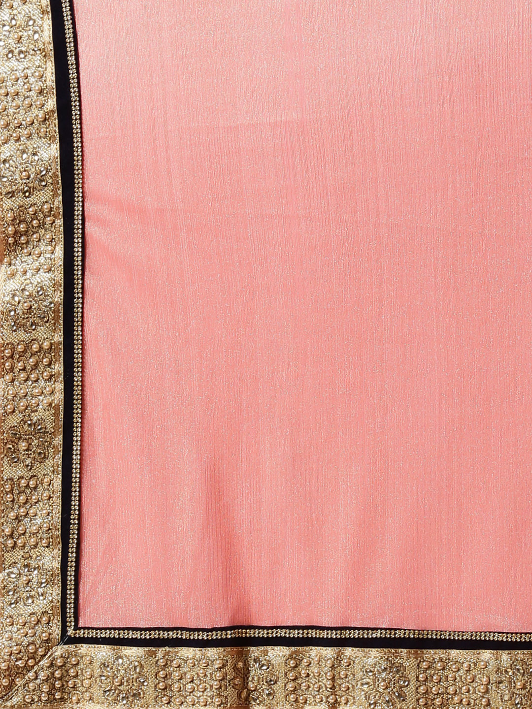Chhabra 555 Peach Stretch georgette Saree with Pearl and Crystal Embellished border